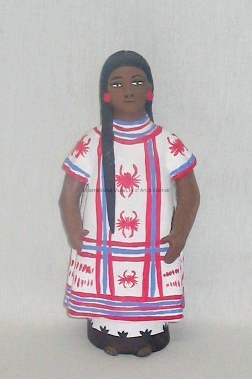 A clay figurine of a woman wearing a white dress with blue and red detailing. She has long black hair and is wearing red earrings.Made/Created