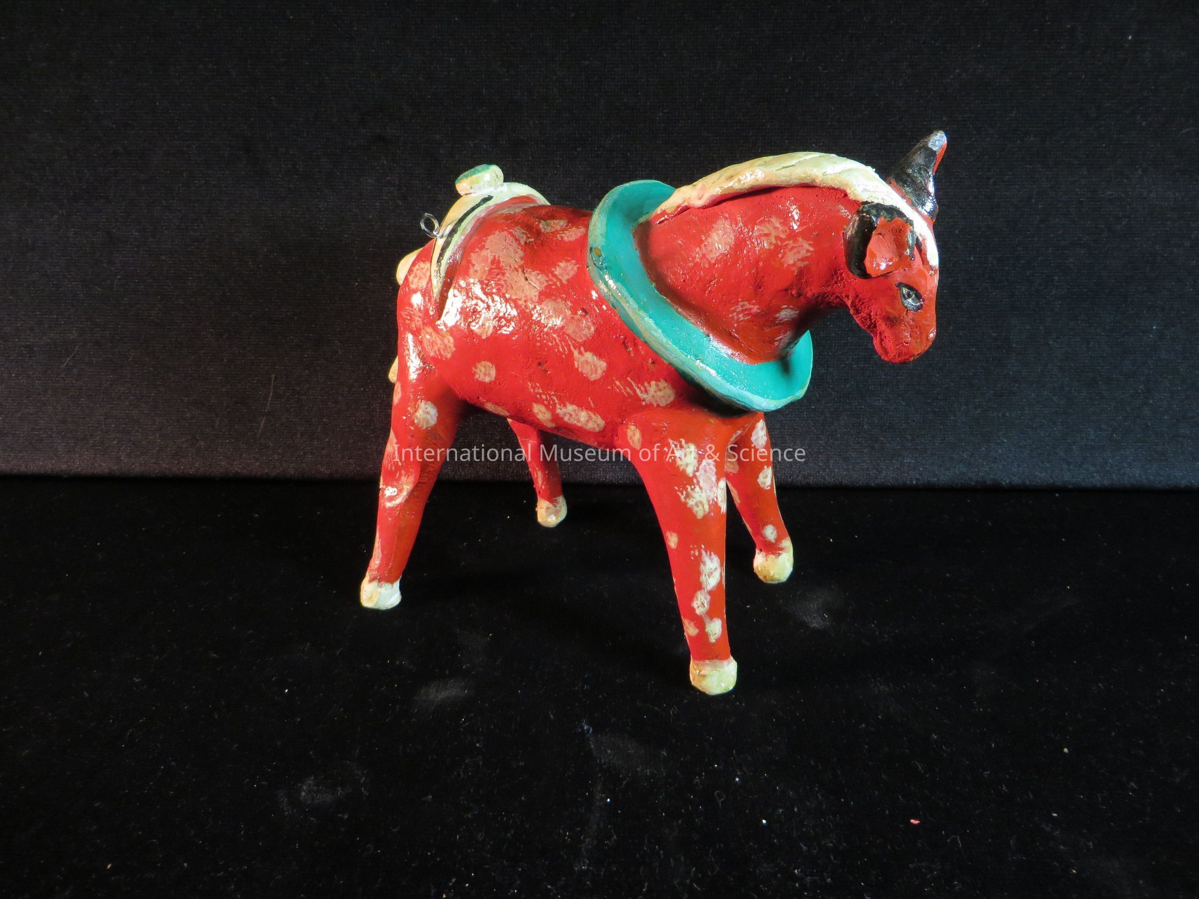 A red horse with white mane and tail, with a green/white saddle ring. Dots decorate the body. The horse is part of a group which has two horses and a carriage holding three figures.Artwork Details