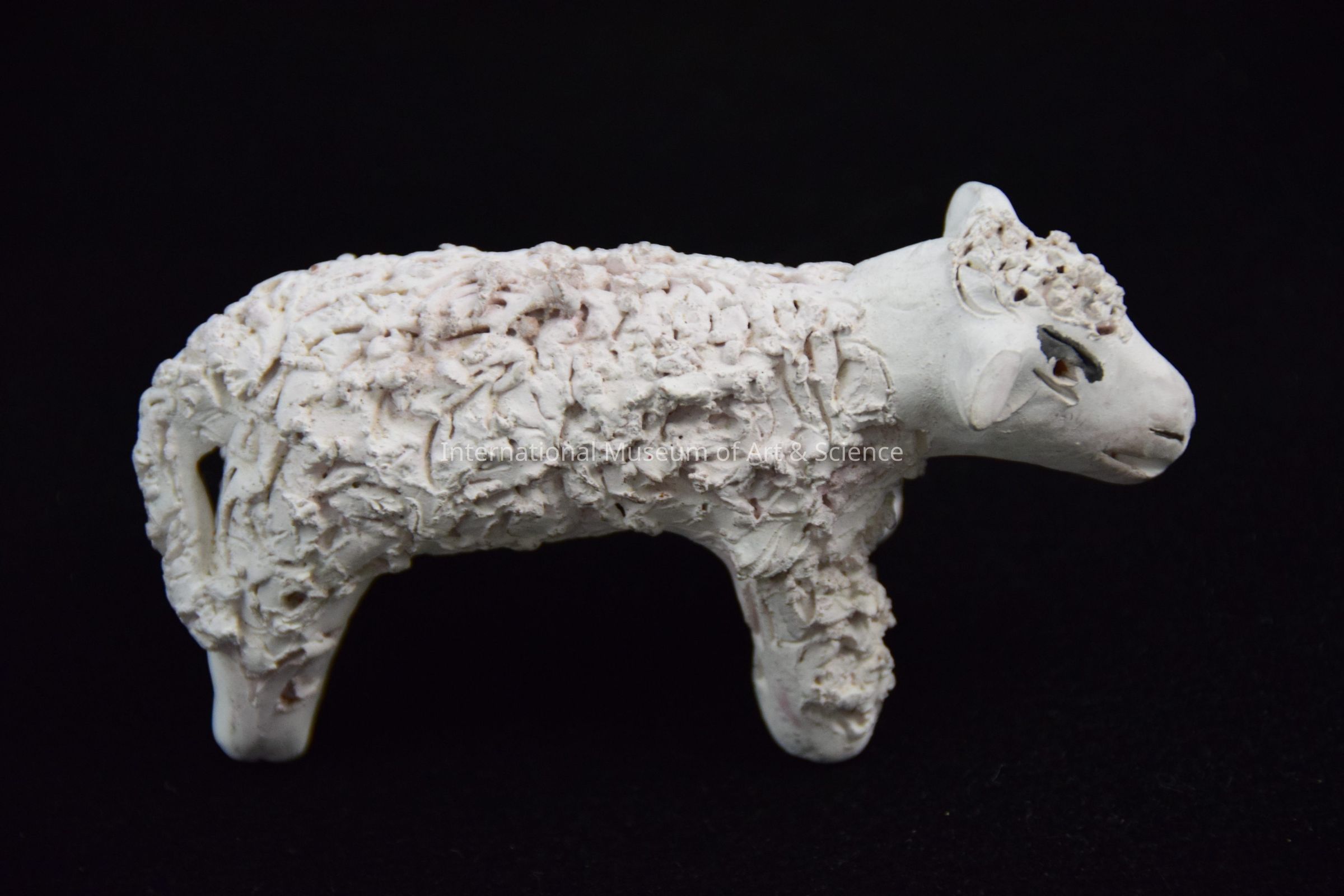 A ceramic figurine of a sheep. It is colored white with black eyebrows. The clay has been texured to look like wool. It is part of a Wedding party and cart scene.Dimensions