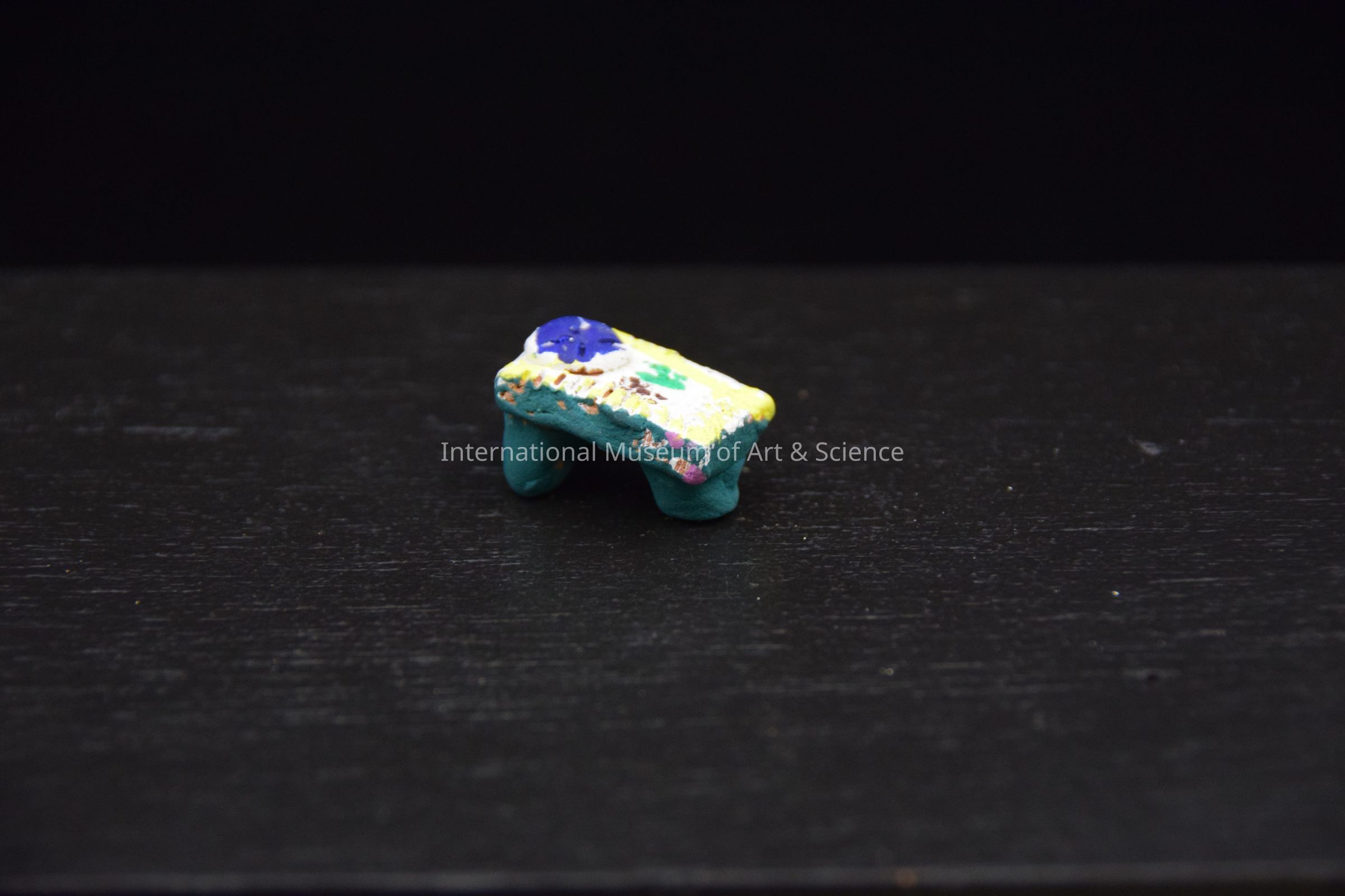 A ceramic figurine of a crib/manger. The crib has a dark green base and is detailed with white, yellow, and navy blue. It is part of a 13 piece Nativity scene (nacimiento) or Creche.Made/Created