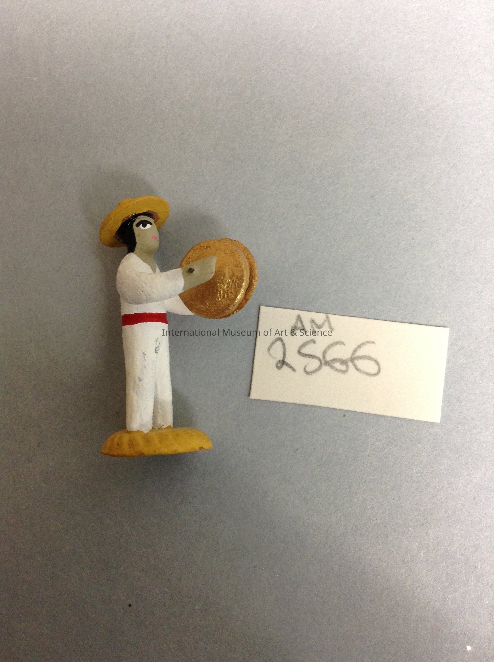 A miniature wooden figurine of a male jalisco garb playing gold cymbals. The figure is wearing white clothing and a yellow sombrero. The figuine is part of a nine figure jalisco group.Artwork Details