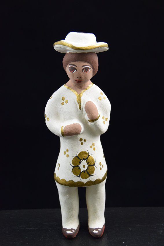 A ceramic figurine of a Sheperd Man. He is wearing a white tunic, white pants, and a hat. His outfit is decorated with black and gold floral motifs. He is part of a 16 piece Nativity Set.Dimensions