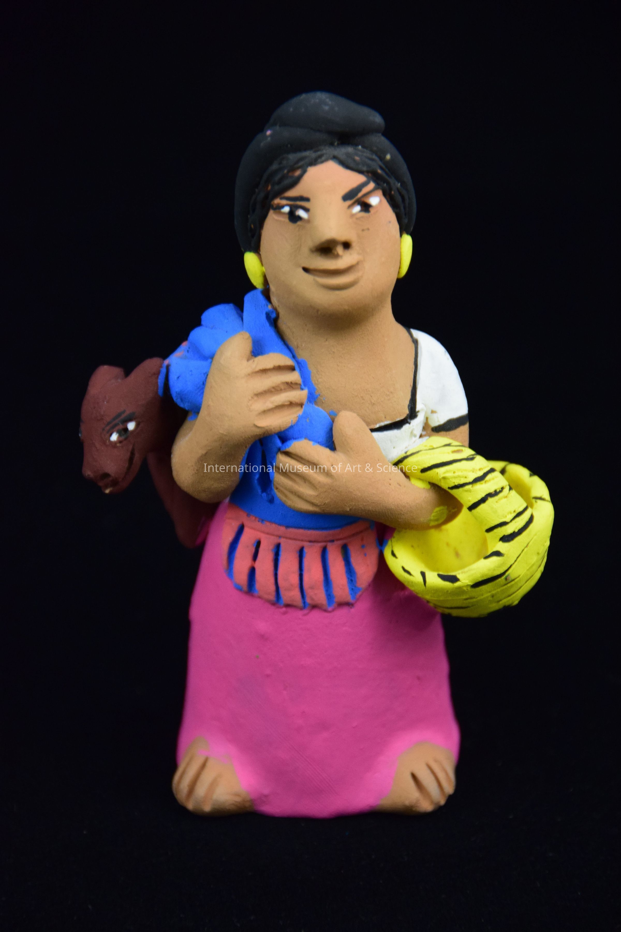 A ceramic figurine of a woman with a basket under her left arm and a dog wrapped in a shawl over her right shoulder. She is wearing a white blouse, pink skirt, and yellow earrings. She is part of a Market Women Scene.