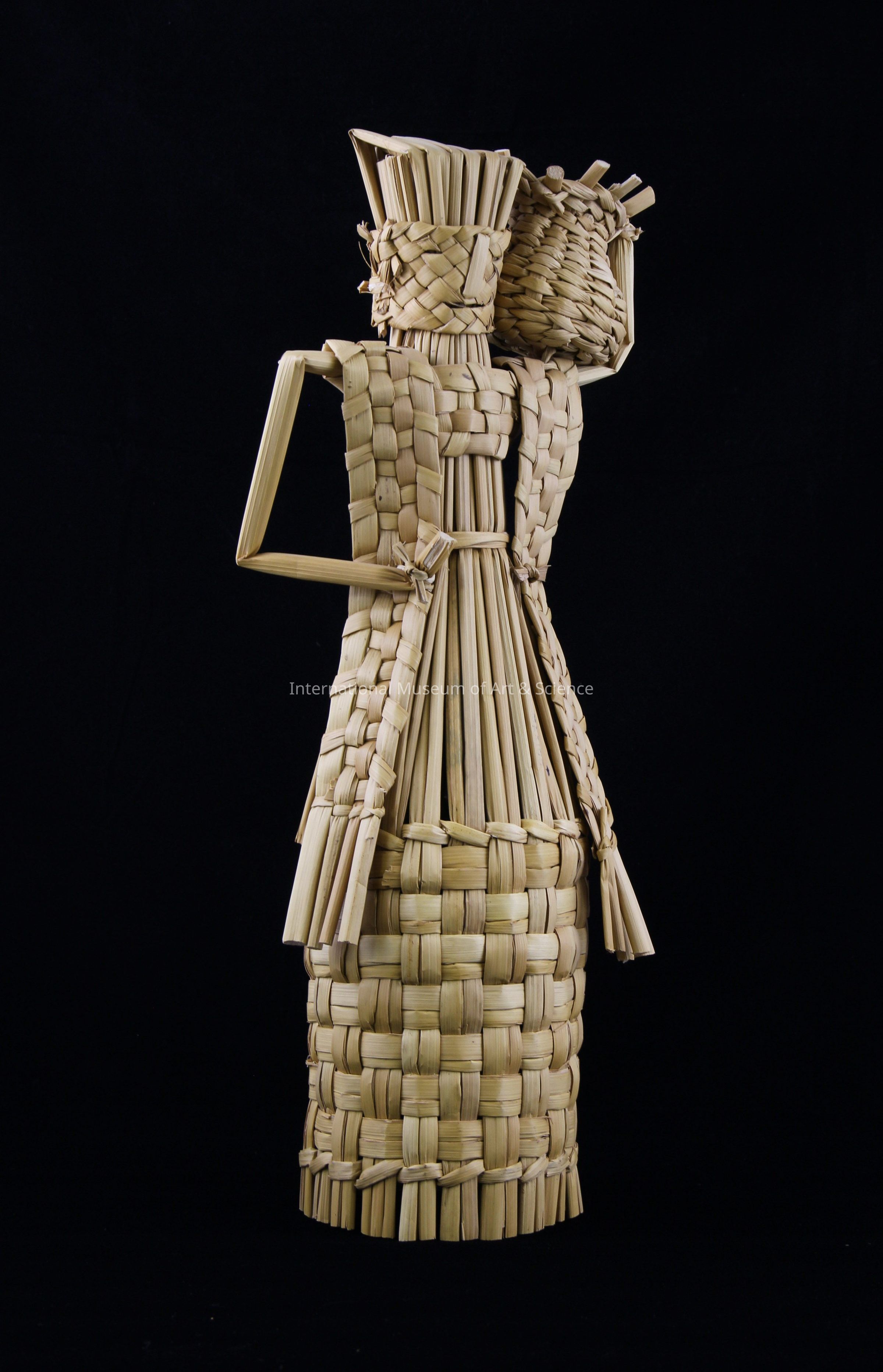 A straw figure of a woman. The figure is holding pot on her shoulder. The piece is woven from reeds from lake Tzintzuntzan, Michoacan, Mexico.Dimensions