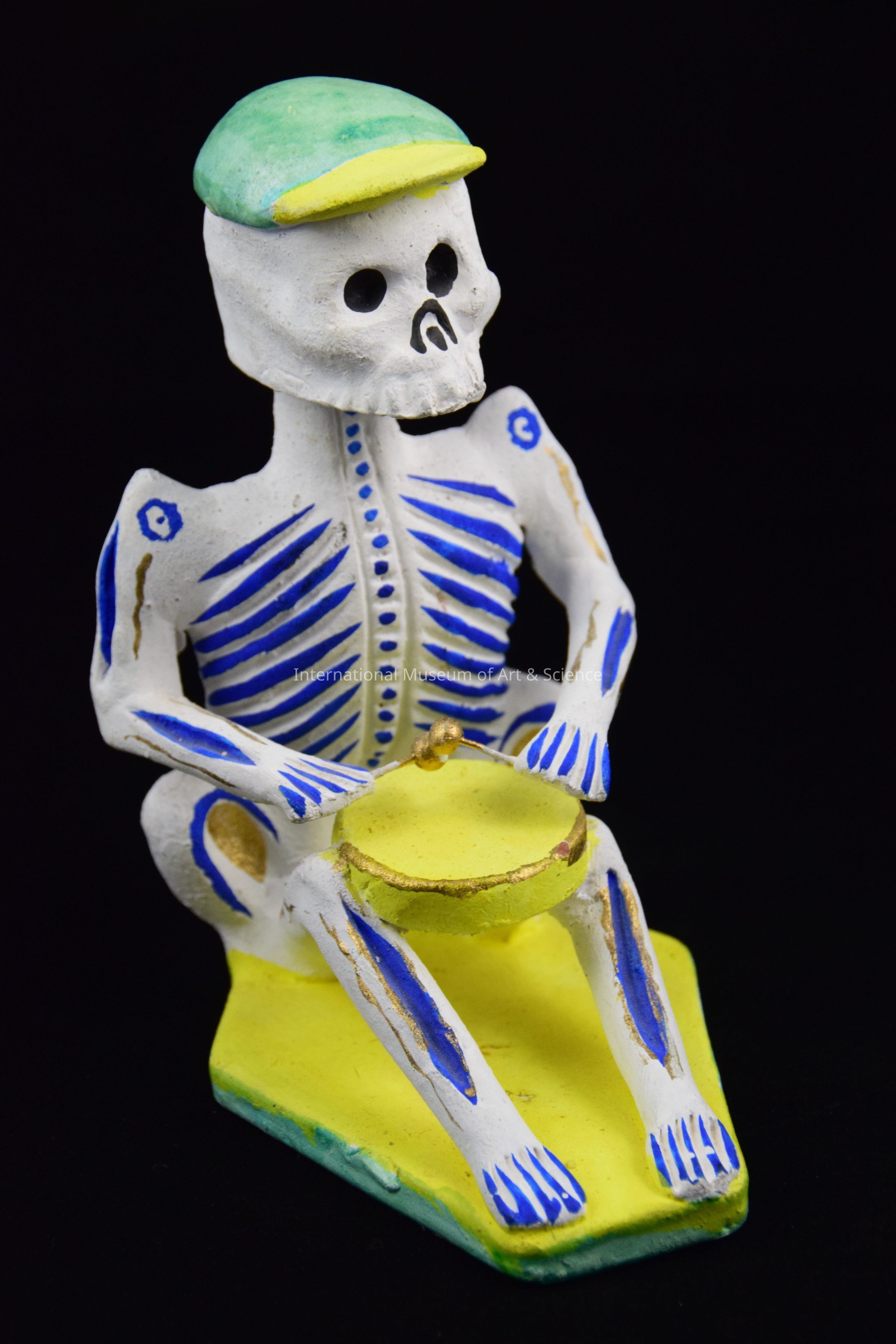 A clay figurine of a skeleton musican. The skeleton is seated on a yellow base in the shape of a coffin. The skeleton is painted white with blue and gold detailing. It is wearing a green and yellow hat. It is playing a yellow drum. It is a part of a group of 5 skeleton musicans.