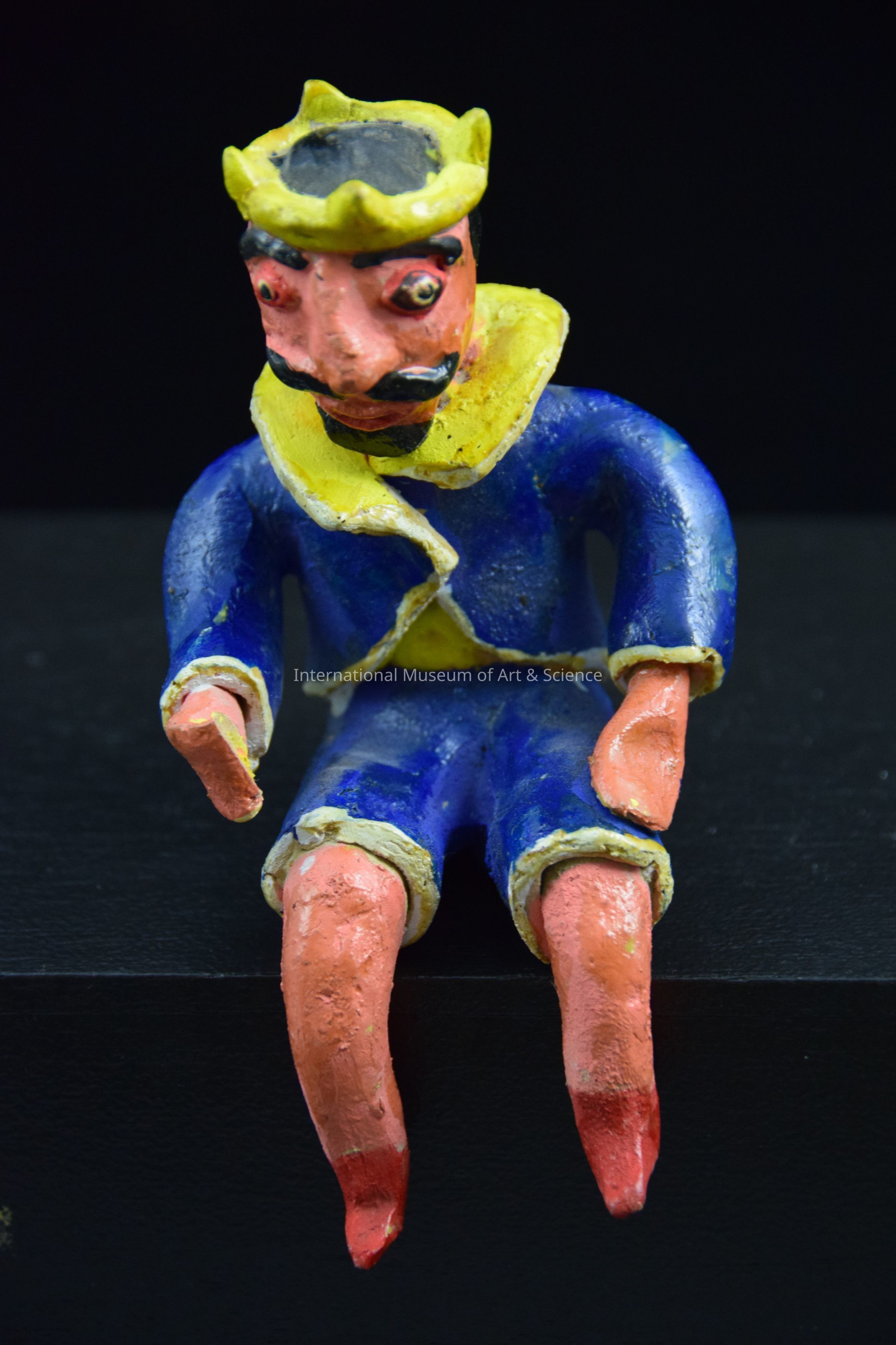 A ceramic figurine of a man. He is in a sitting position. He is wearing a blue jacket with matching shorts. He is wearing a crown and has a black moustache and beard. Something use to be in his right hand.