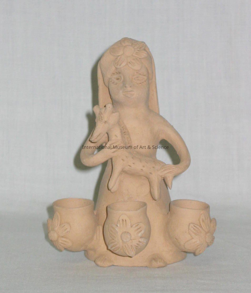 A clay figurine of a woman. The woman is holding an animal in her arms (a horse?), and has three pots in front. She is wearing a head scraf with a flower on the front.