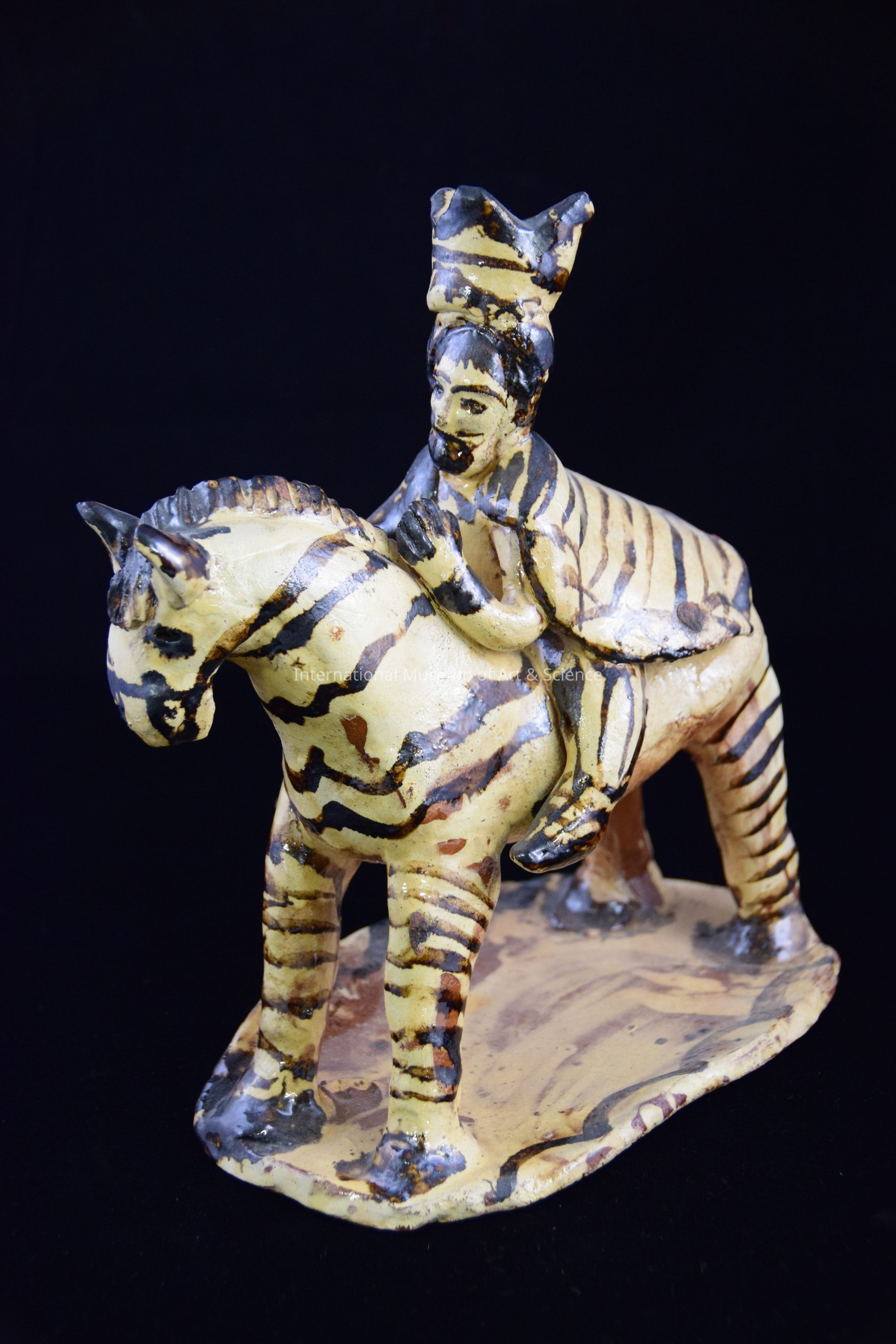 A ceramic figurine of a king of horseback. The figure has on a cape and crown. The details on the face show a beard and long dark hair. The piece is glazed in cream and dark brown. The figure may be part of a Nativity scene.Dimensions