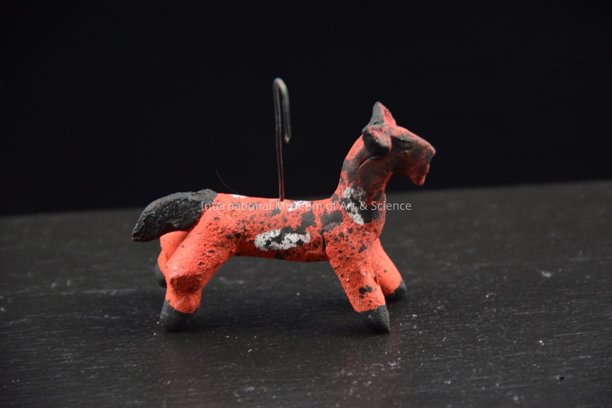 A ceramic figurine of a carousel animal. The animal is a horse with an orange, white, and black body, red ears, and black details to the mane and hooves. There is a hooked wire through the body to attach it to the carousel.