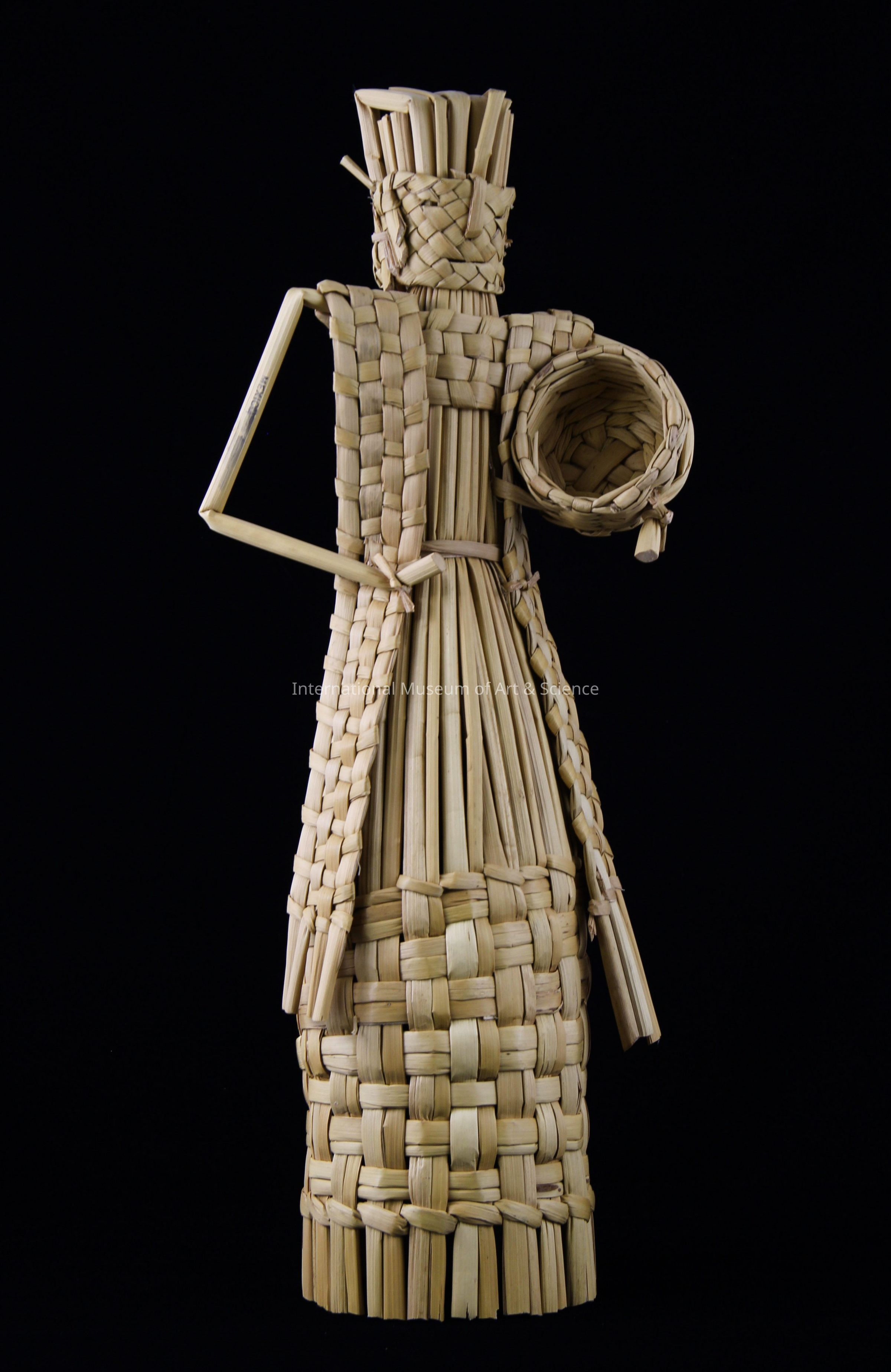 A straw figure of a woman. The figure is holding a pot under her arm. The piece is woven from reeds from Lake Patzcuaro.Dimensions