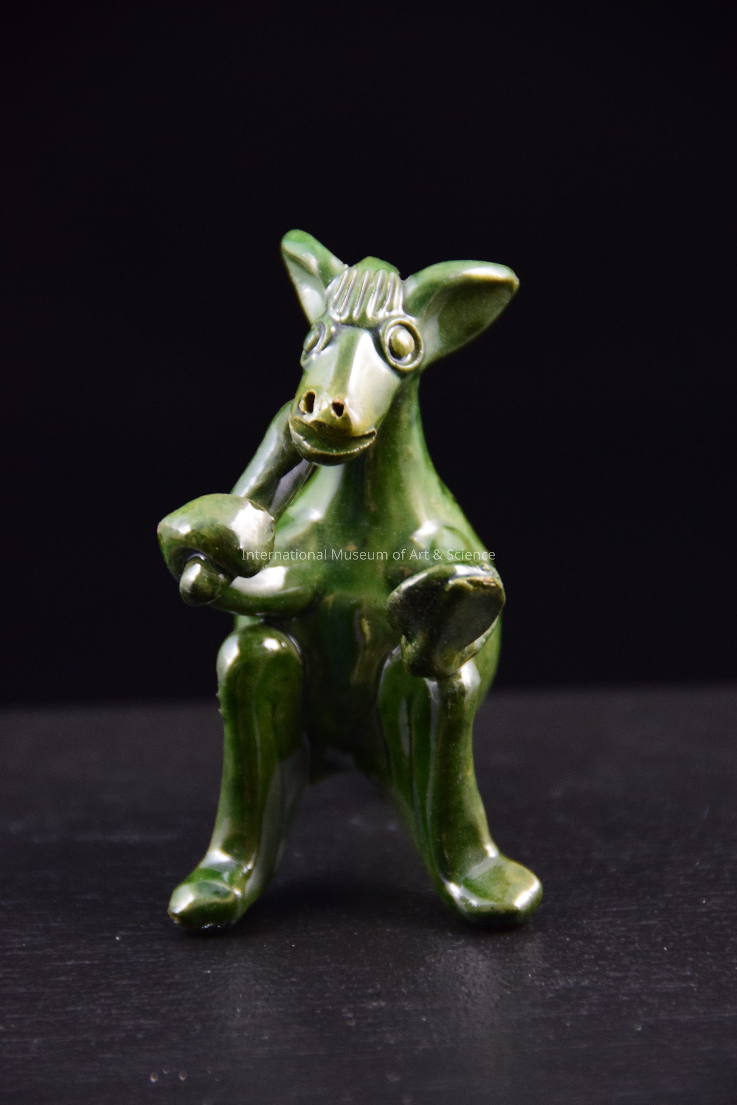 A ceramic figurine of an animal playing an instrument. The animal is propped up on its hind legs and tail and is playing a percussion instrument. It is glazed in dark green. There is a hole in the animal's back. This piece is part of a group of animals playing musical instruments.Dimensions