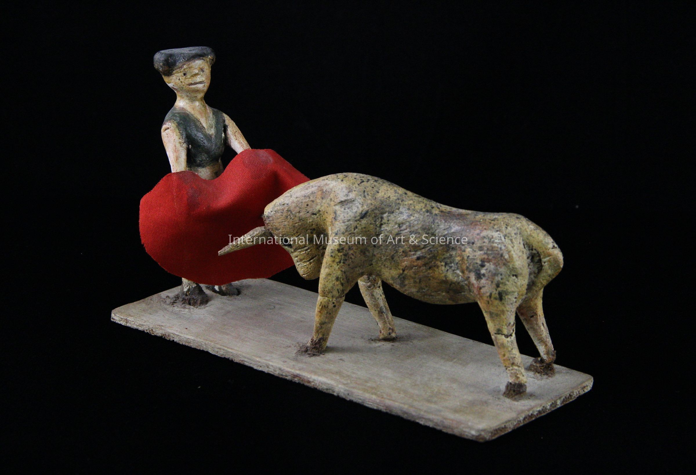 A small bullfight scene. The scene is created out of wood. It has the bullfighter holding red cape in front of a charging bull. The bullfighter has a flat black hat, a vest and beige with gold pants. The charging bull overall beige with scattered black. They both stand on a rectangular wooden base.Artwork Details