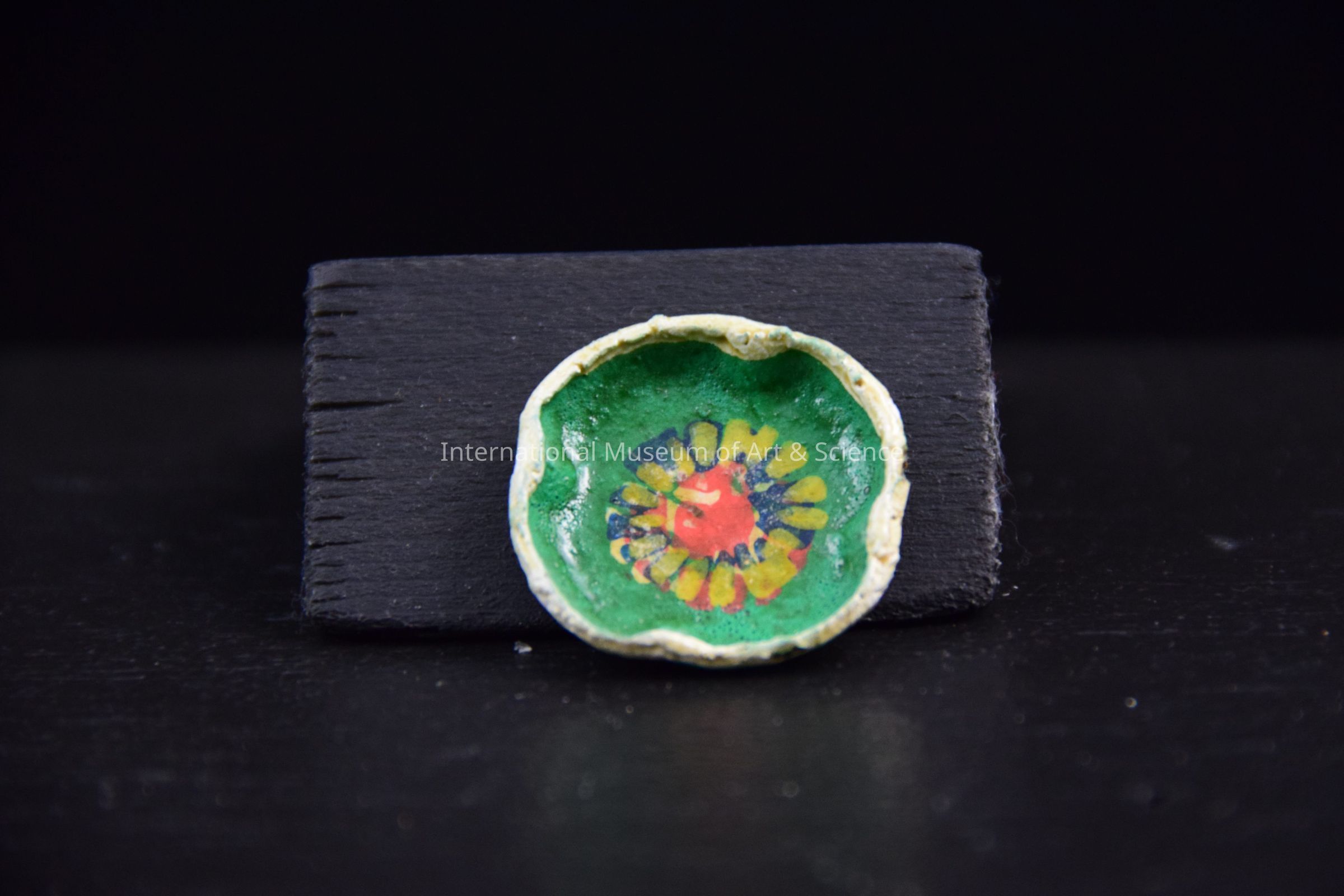 A ceramic miniature nested pottery platter. The inside is painted green with floral designs. There is a white curved edge.Artwork Details