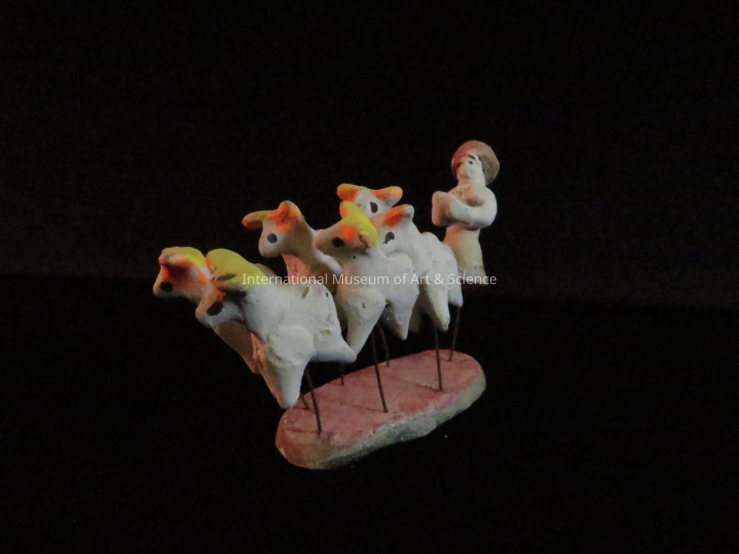 Nacimiento figure. Sheperdess with sheep; figures mounted on wires set into a small oval clay base. Sheperdess wearing a hat painted yellow and purple; top is unpainted and bottom painted yellow with purple; six sheep partially painted, sheeps ears painted yellow with orange and black painted eyes; oval base painted pink and green.Dimensions