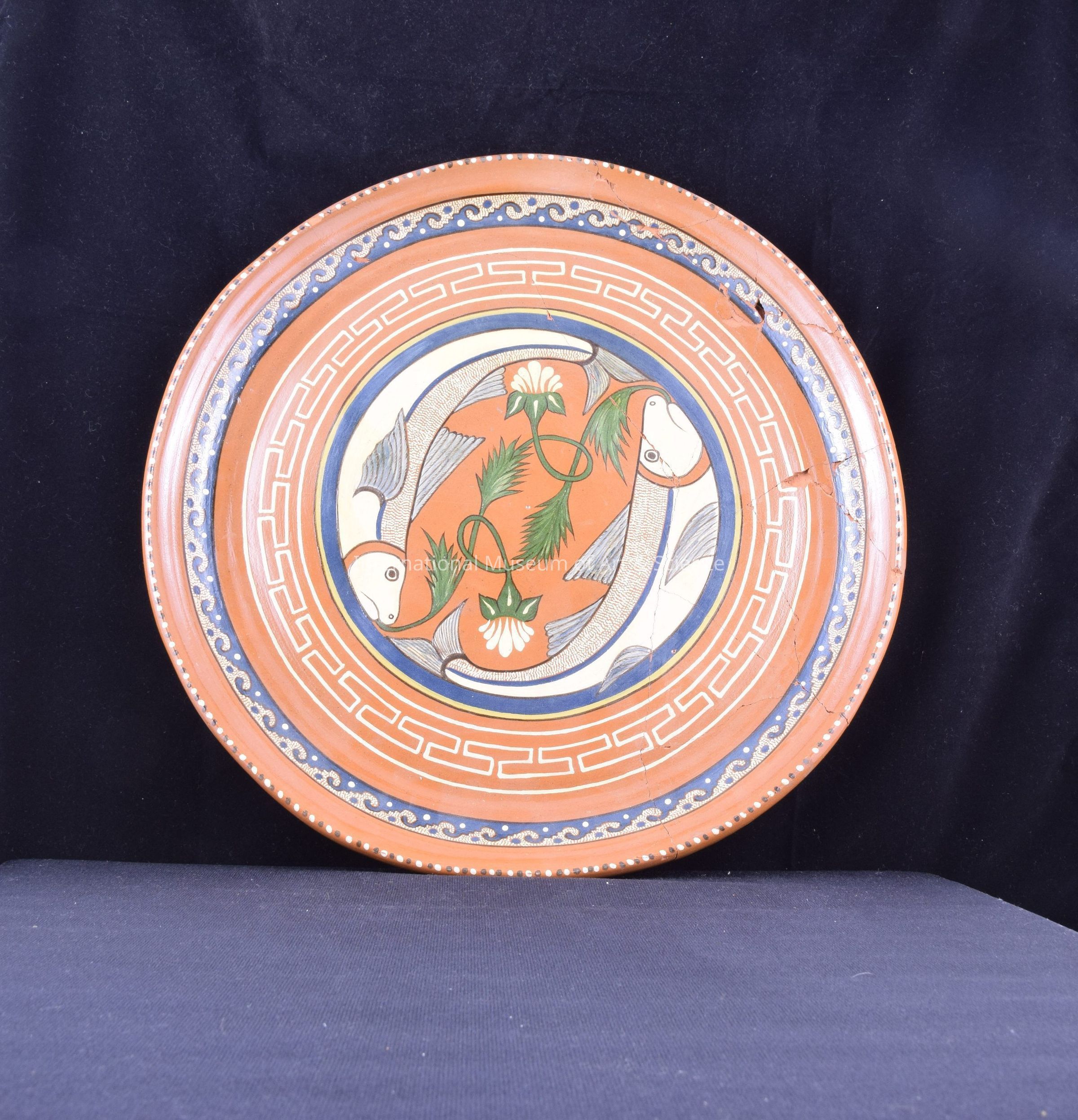 Large fish platter, rust ground color; interior elaborately decorated; top edge has brown and white dots consecutively; followed by a band with wave and dots designs; wider band below with running geometric designs followed by a yellow band, then a wider band painted blue; at center two large fishes circling floral motifs.Made/Created