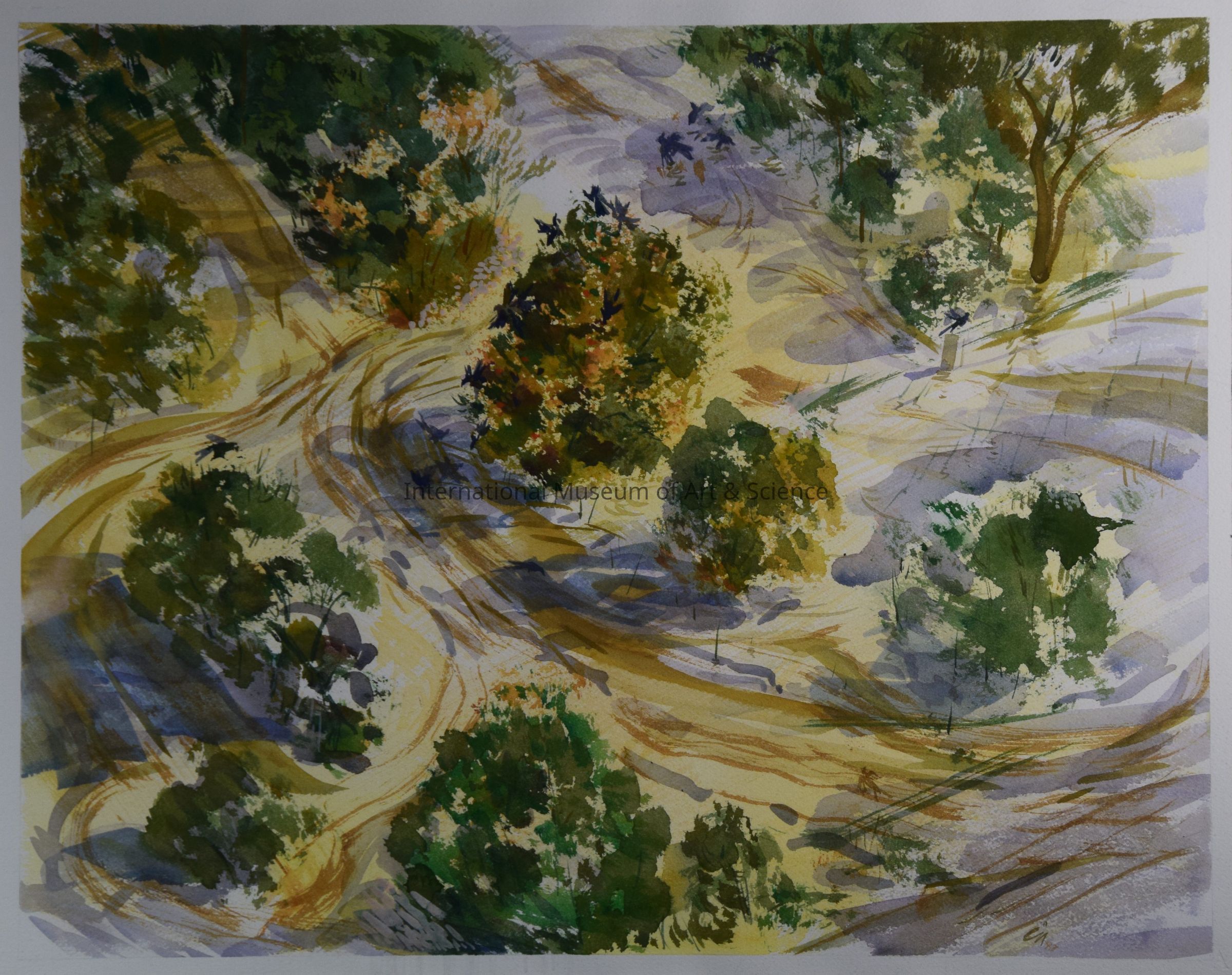 "Five Trees with Birds". This watercolor sows many trees from an aerial view with birds and trails.Artwork Details
