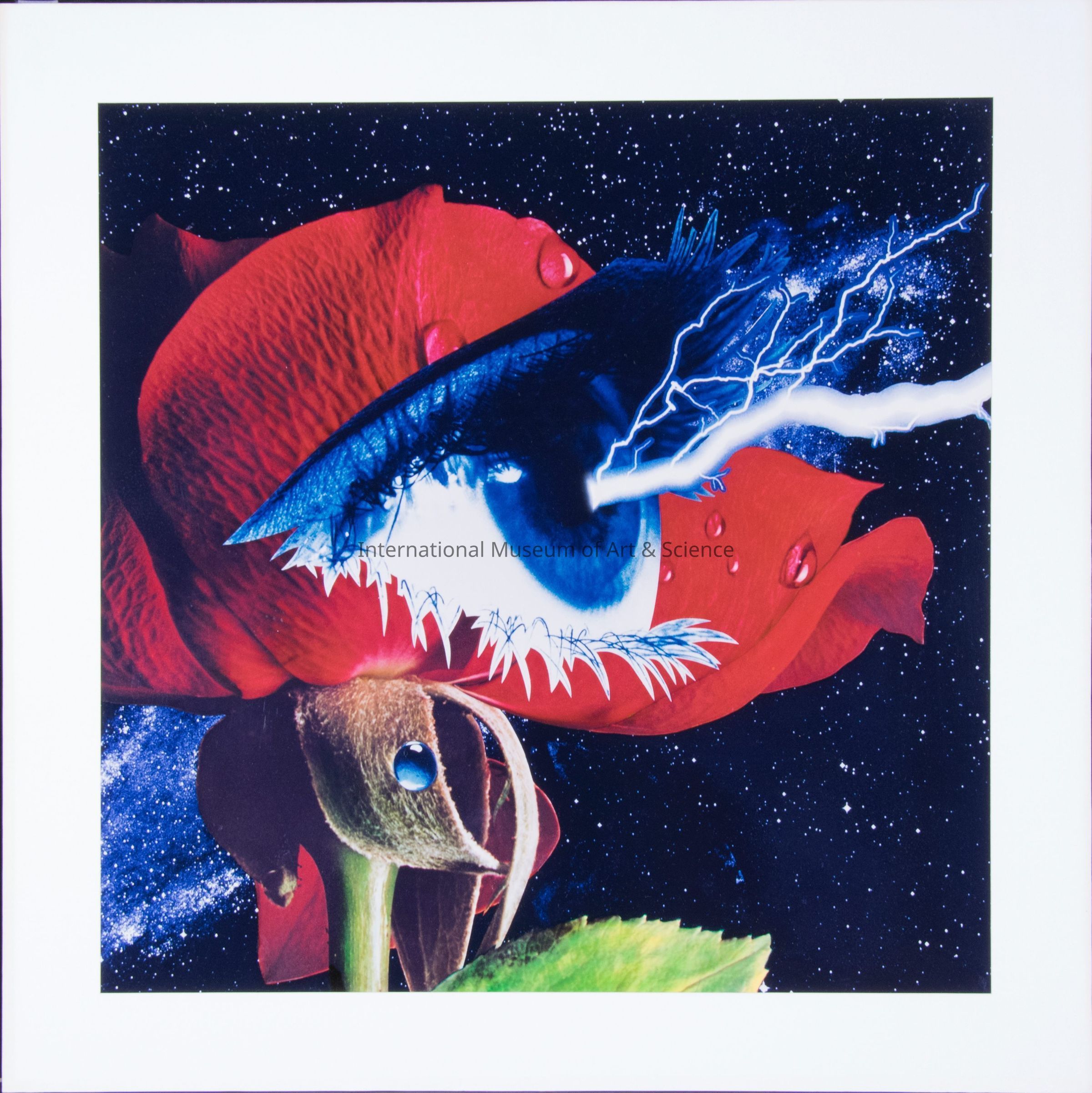"Flash". Mansfield, American. Photograph. Unknown Date. Blue eye in immense red rose, lightning bolt hitting pupil, starry sky background, teardrop or dew on petals and stem; mounted on white paper and masonite.Artwork Details