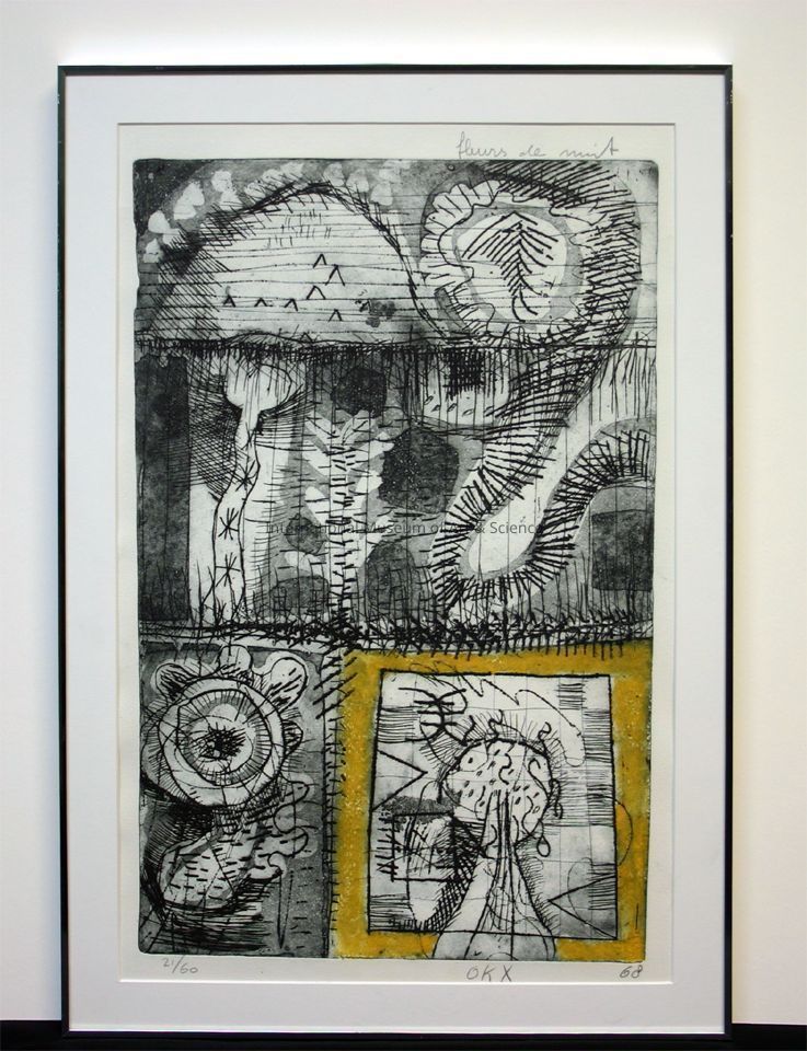 "Fleur de Nuit". Kees Okx, Dutch. Etching on paper. 1968. matted & framed; etching depicts various abstract forms appearing to be organic mushrooms, flowers, and a large snake; overall black, white, and grey; yellow-orange linear designs scattered throughout forms, vertically, horizontally, zig-zagged, blocks, and stars; scattered blocks of white and black; white splotches throughout; 21/60.Dimensions