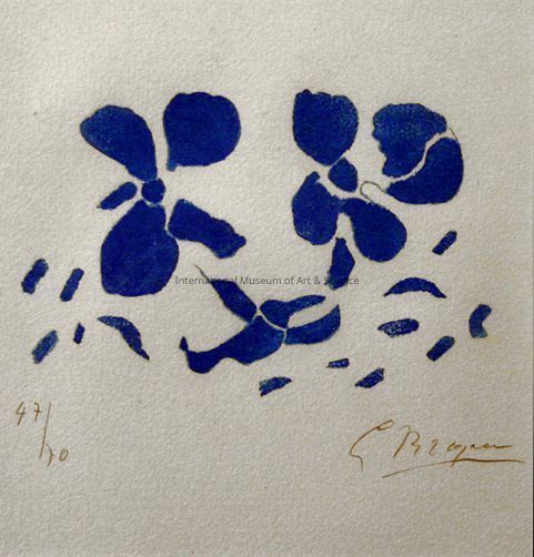"Flowers" Georges Braque, French. Woodcut on paper. 1960. Stylized flowers in solid blue three stylized flowers in various positions located centrally, small, blue marks placed around area below blue flowers. 47/70.Artwork Details