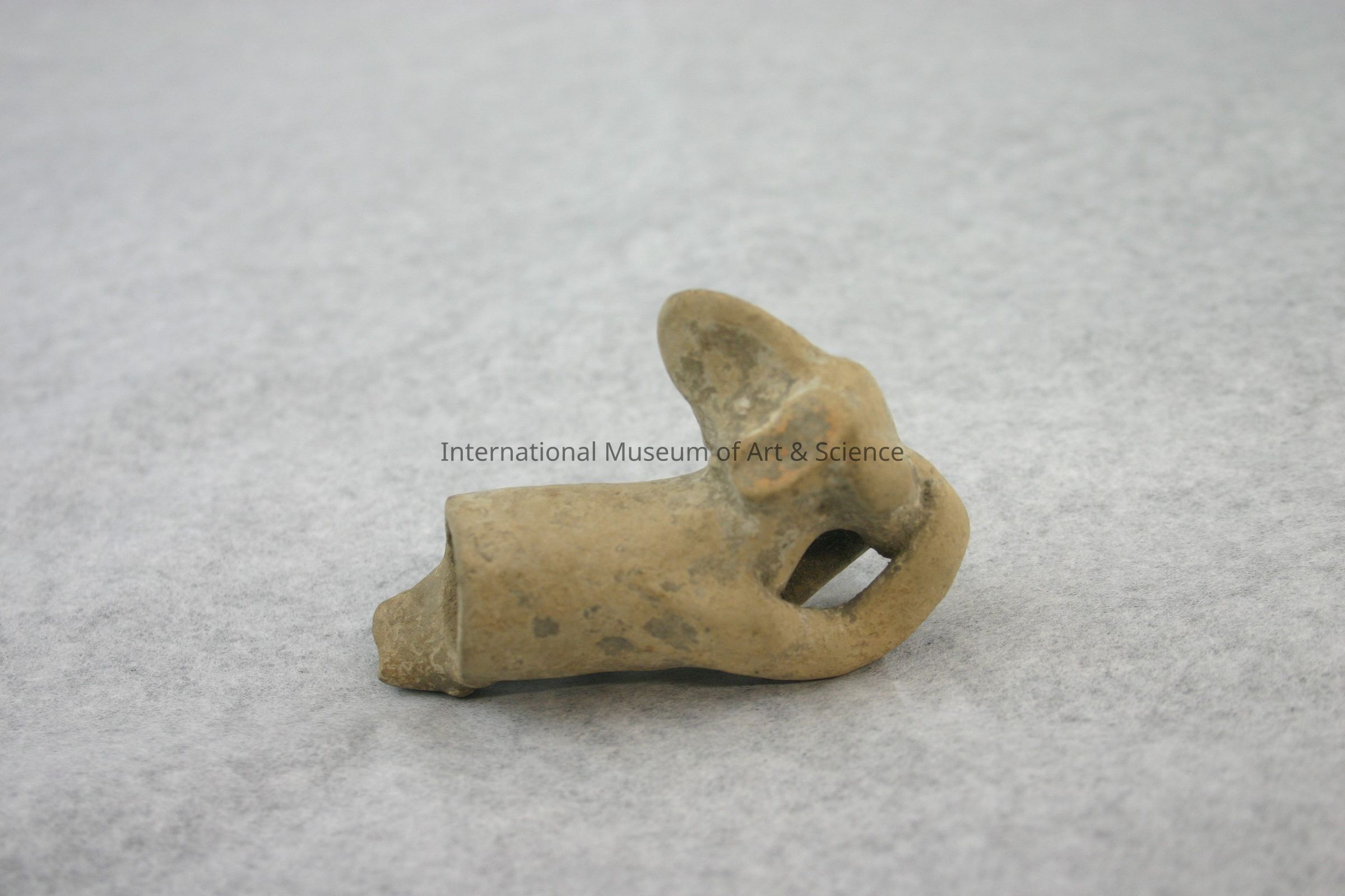 A small clay flute or whistle instrument. The instrument is in the shape of an animal.