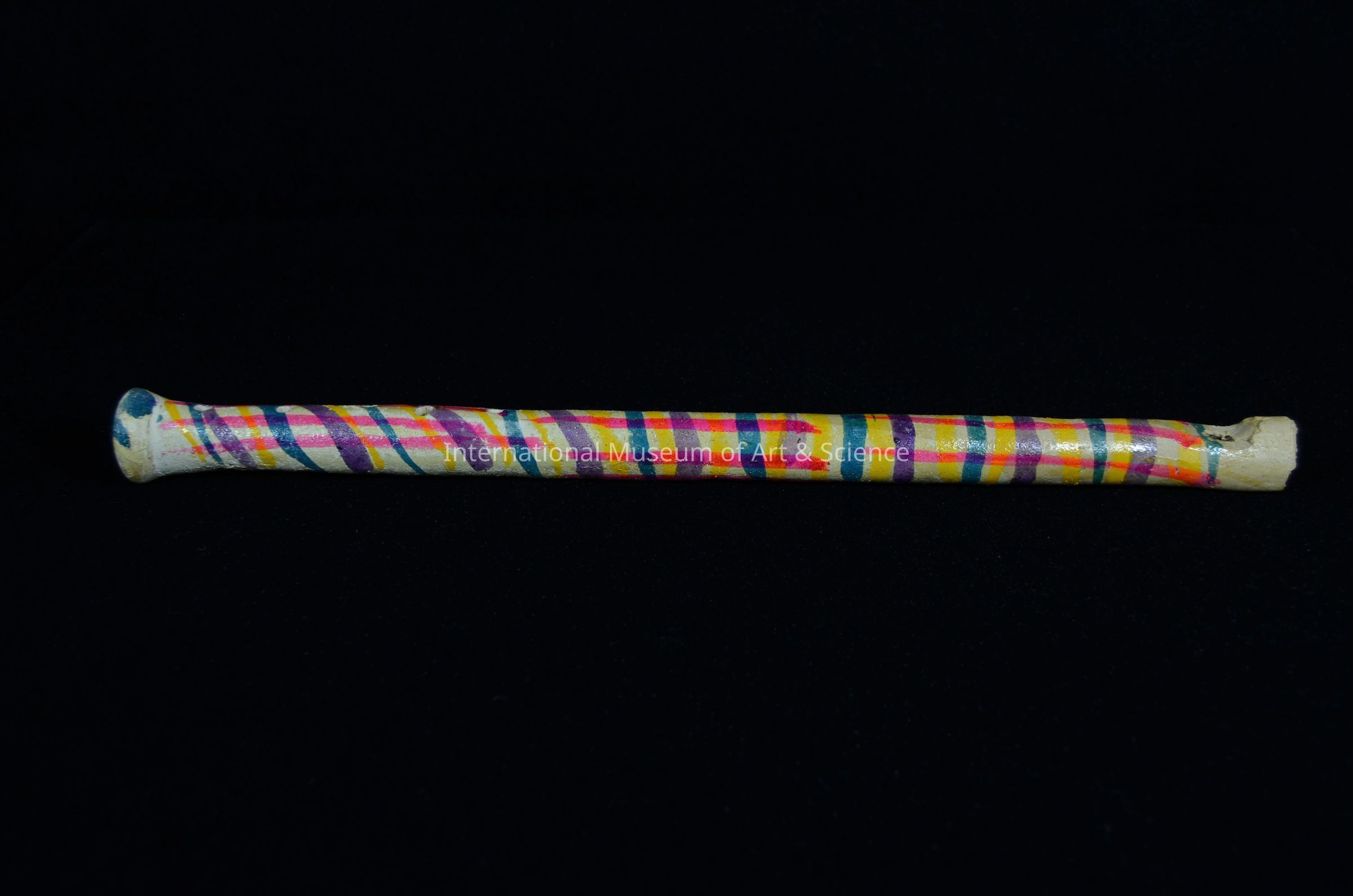 A painted earthenware flute. It is decorated with horizontal and vertical stipes of yellow, rose, purple and dark green, on a beige background. It has five holes and small mouth piece.Dimensions