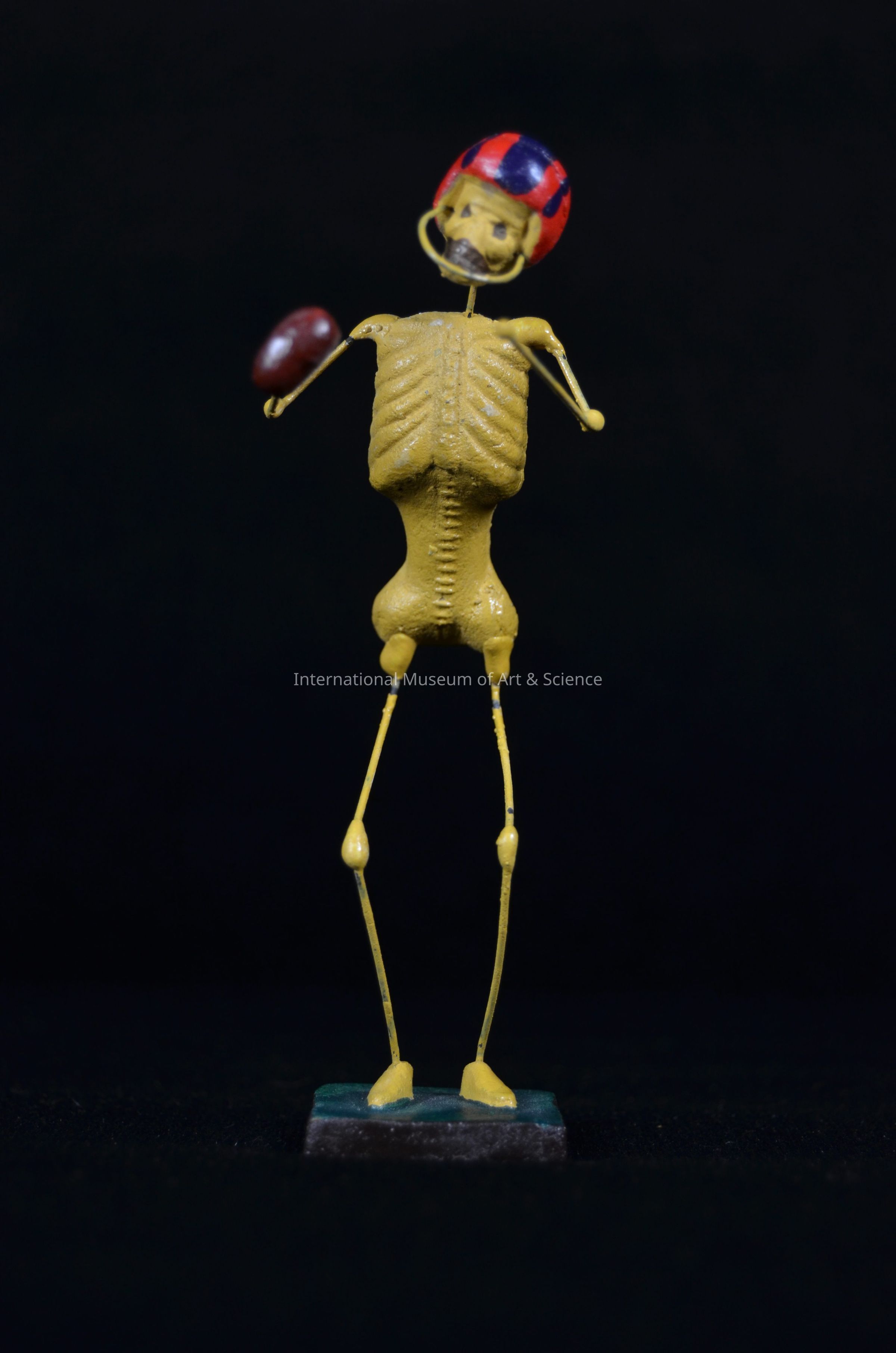 A skeleton figurine. The figure is a skeletal football player. The body is painted a dark cream and the skeleton is wearing a red and blue American football helmet. It is holding a brown American football in its right hand, looking ready to throw.Dimensions