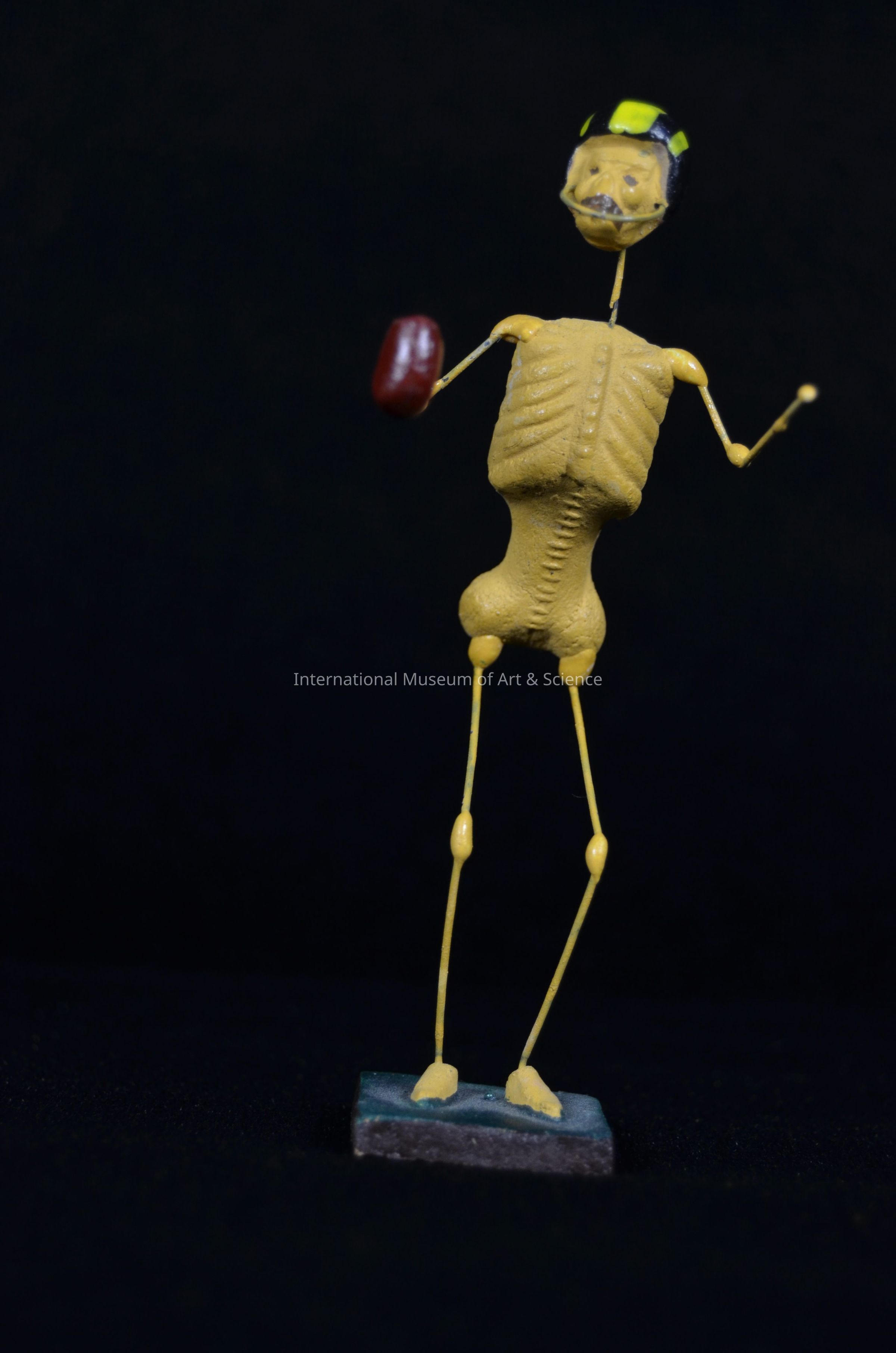 A skeleton figurine. The figure is a skeletal football player. The body is painted a dark cream and the skeleton is wearing a yellow and black American football helmet.Dimensions