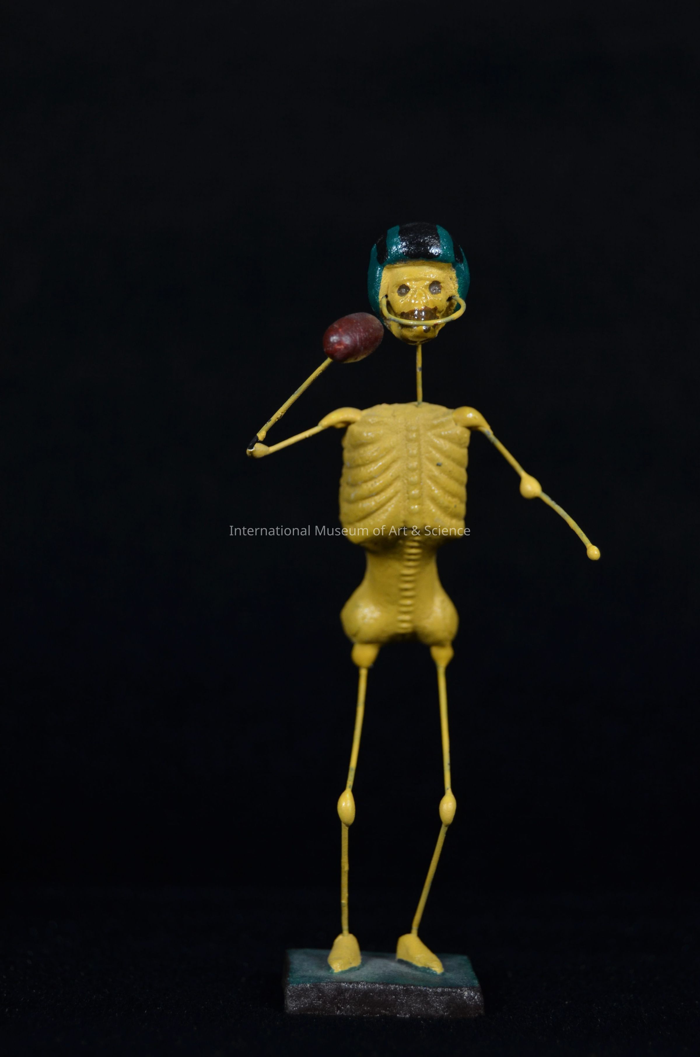 A skeleton figurine. The figure is a skeletal football player. The body is painted a dark cream and the skeleton is wearing a green and black American football helmet. It is holding a brown American football in its right hand, looking ready to throw.Dimensions