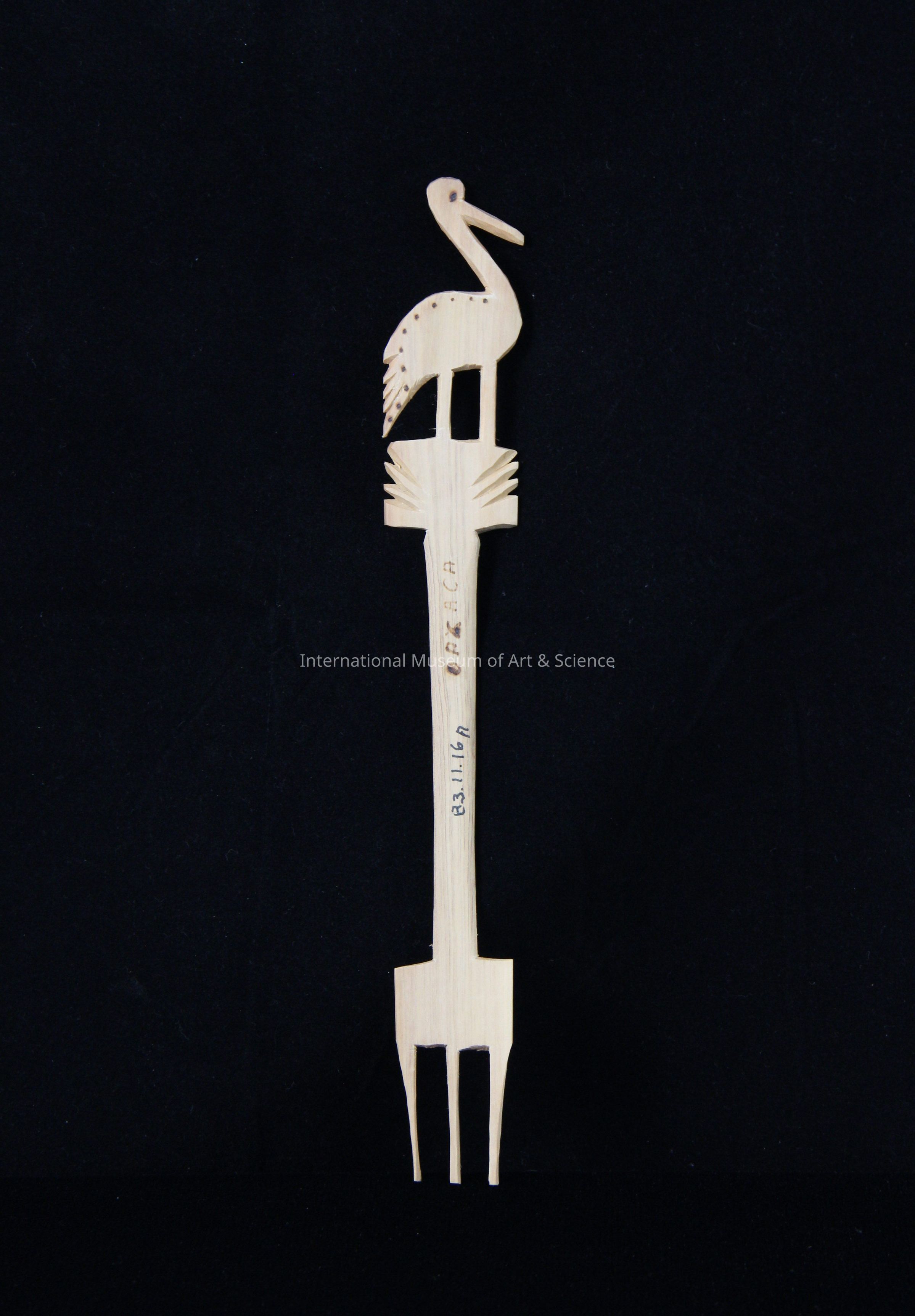 A wooden three-pronged fork. The fork is hand cavred. It has a crane carved on the handle and "Oaxaca" wood-burned on handle.Made/Created