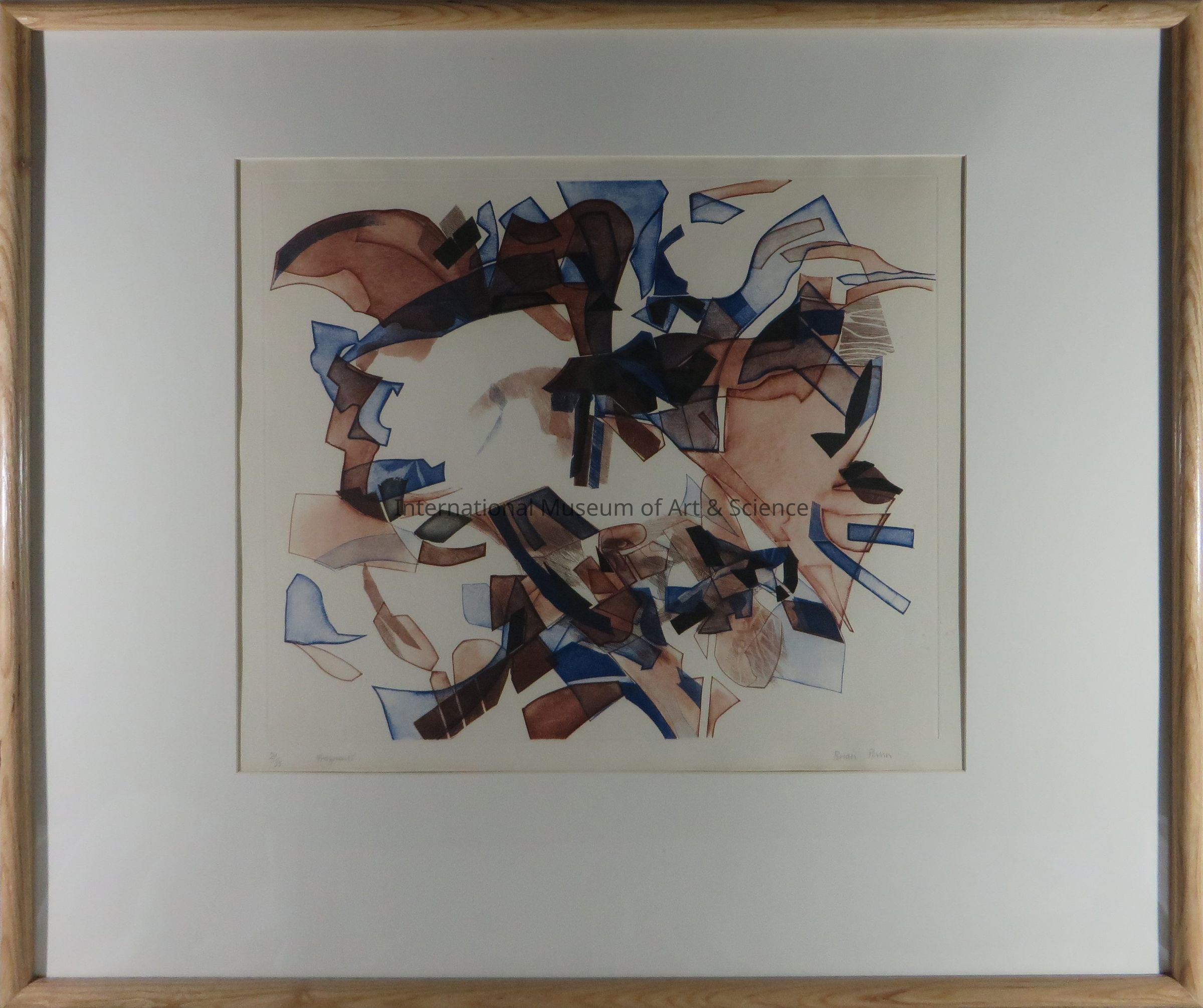 "Fragments", Etching with blue, brown and black fragments over apking and swindling in circular motion. 21/75.Dimensions