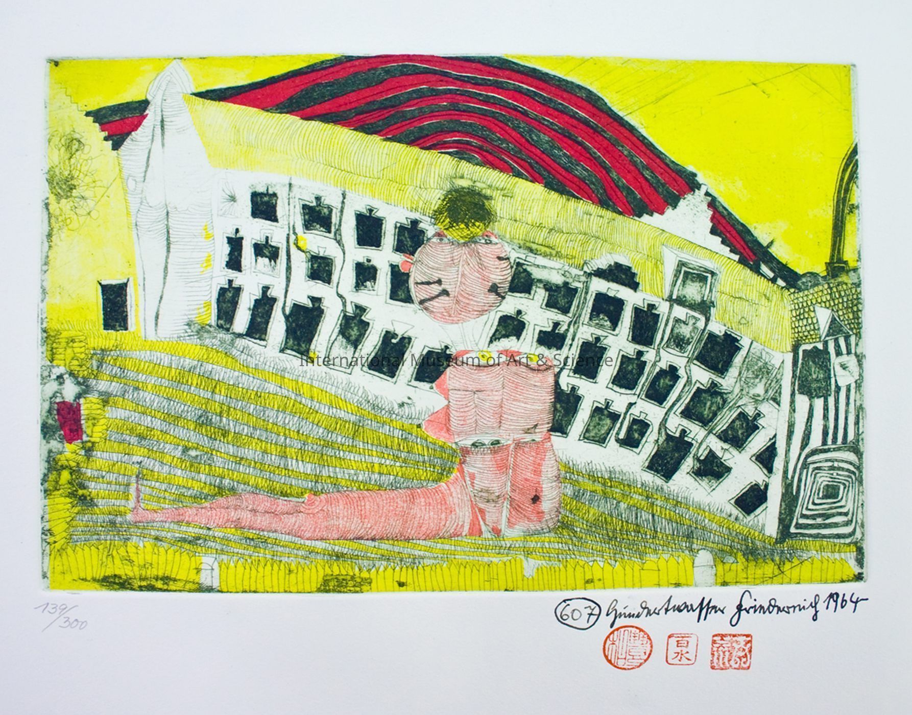 "Girl Finding in the Grass". Friedrich Hundertwasser, Austrian. 1964. Color etcing on paper. 1964. Etching in dark green, yellow, red and pink; 607 numbered in lower right hand corner; published Hanover 1964; signed Marks 139/300.Artwork Details