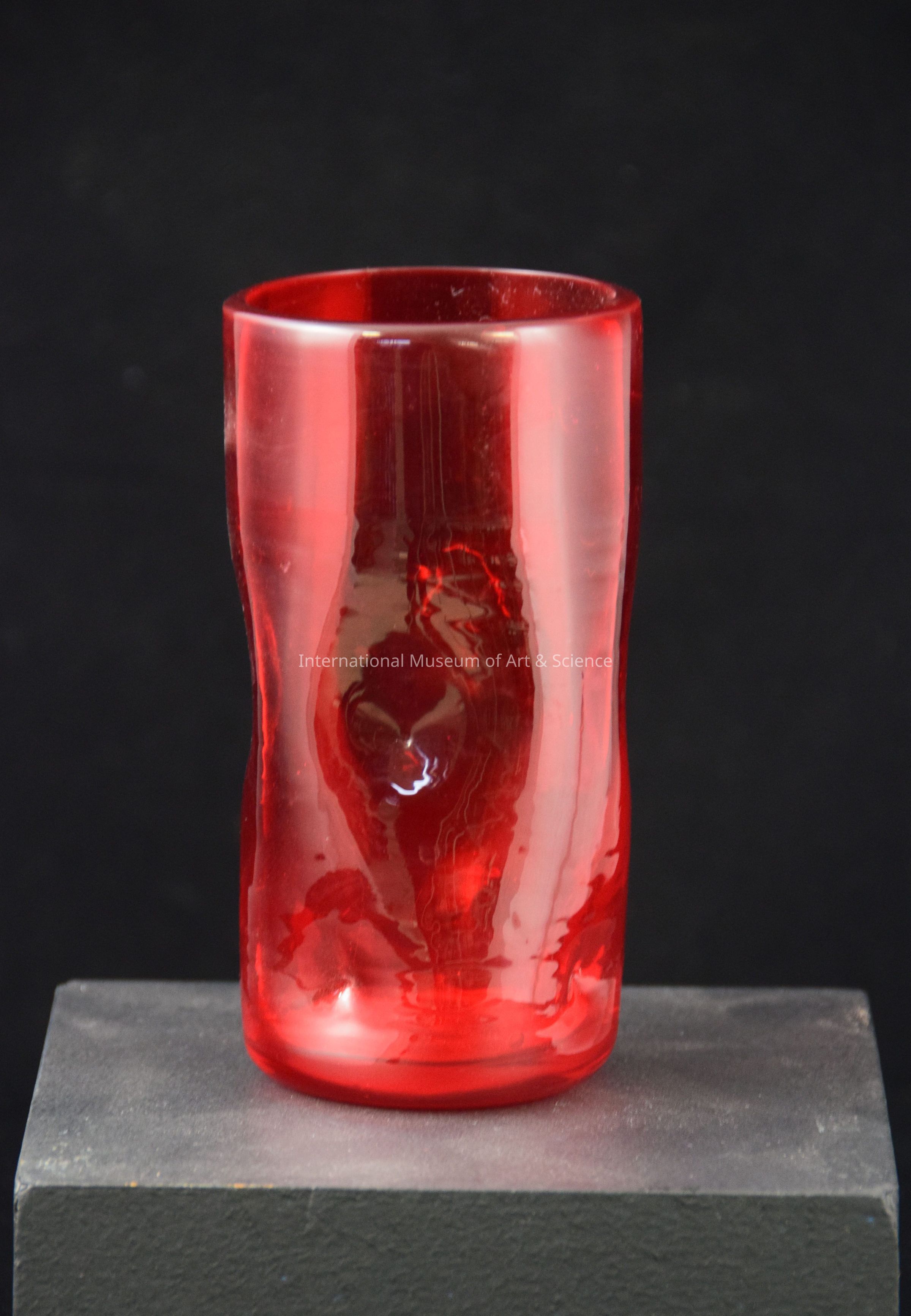 A hand-blown drinking glass. The glass is bright red. There are concave endents on the body of the vessel. There is a round mouth, but the base of the drinking glass is somewhat square.Made/Created