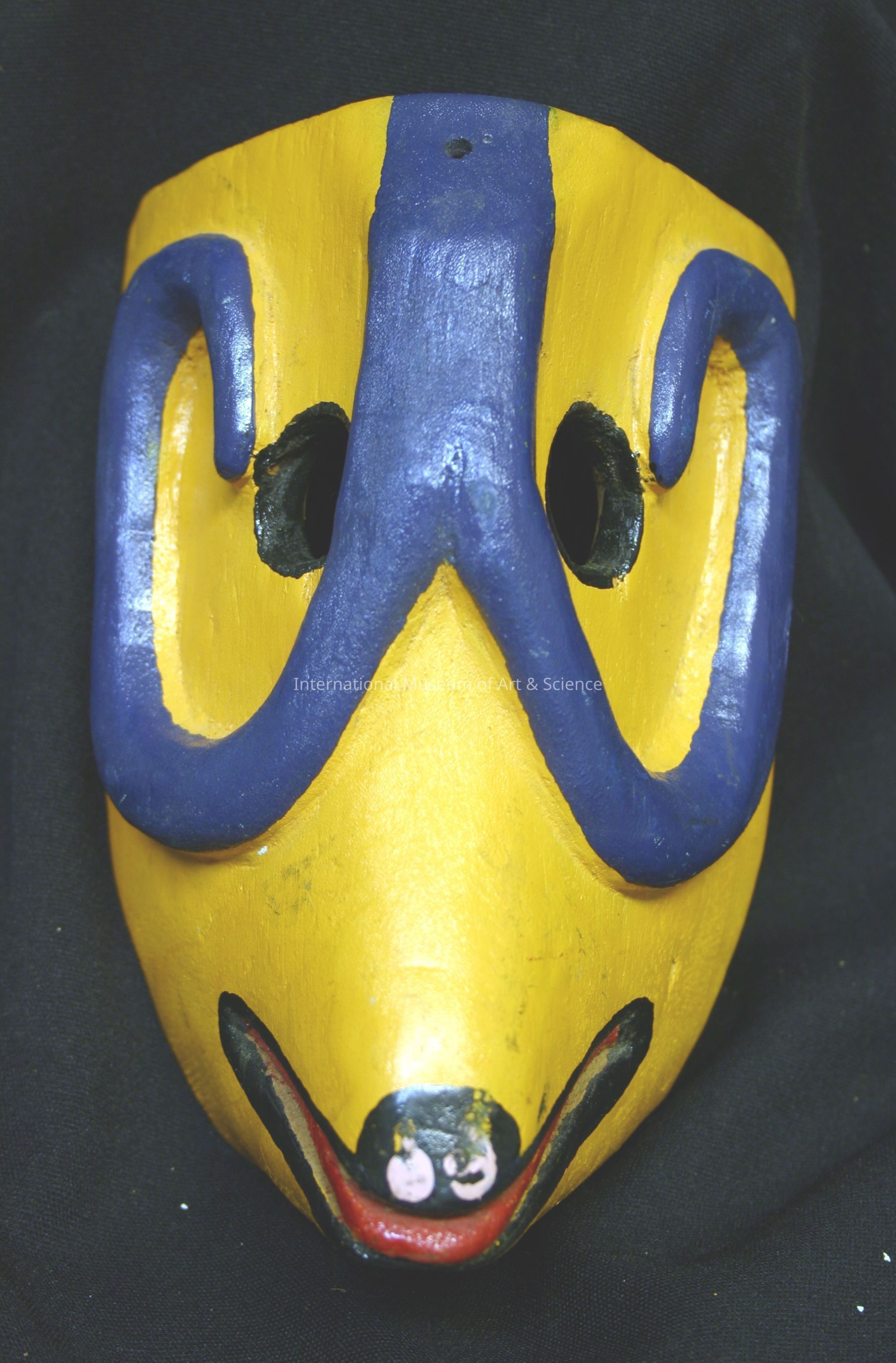 Goat mask. Goat mask overall painted yellow-orange; curved violet-blue horns around eyes; protruded black mouth with red tongue.Made/Created
