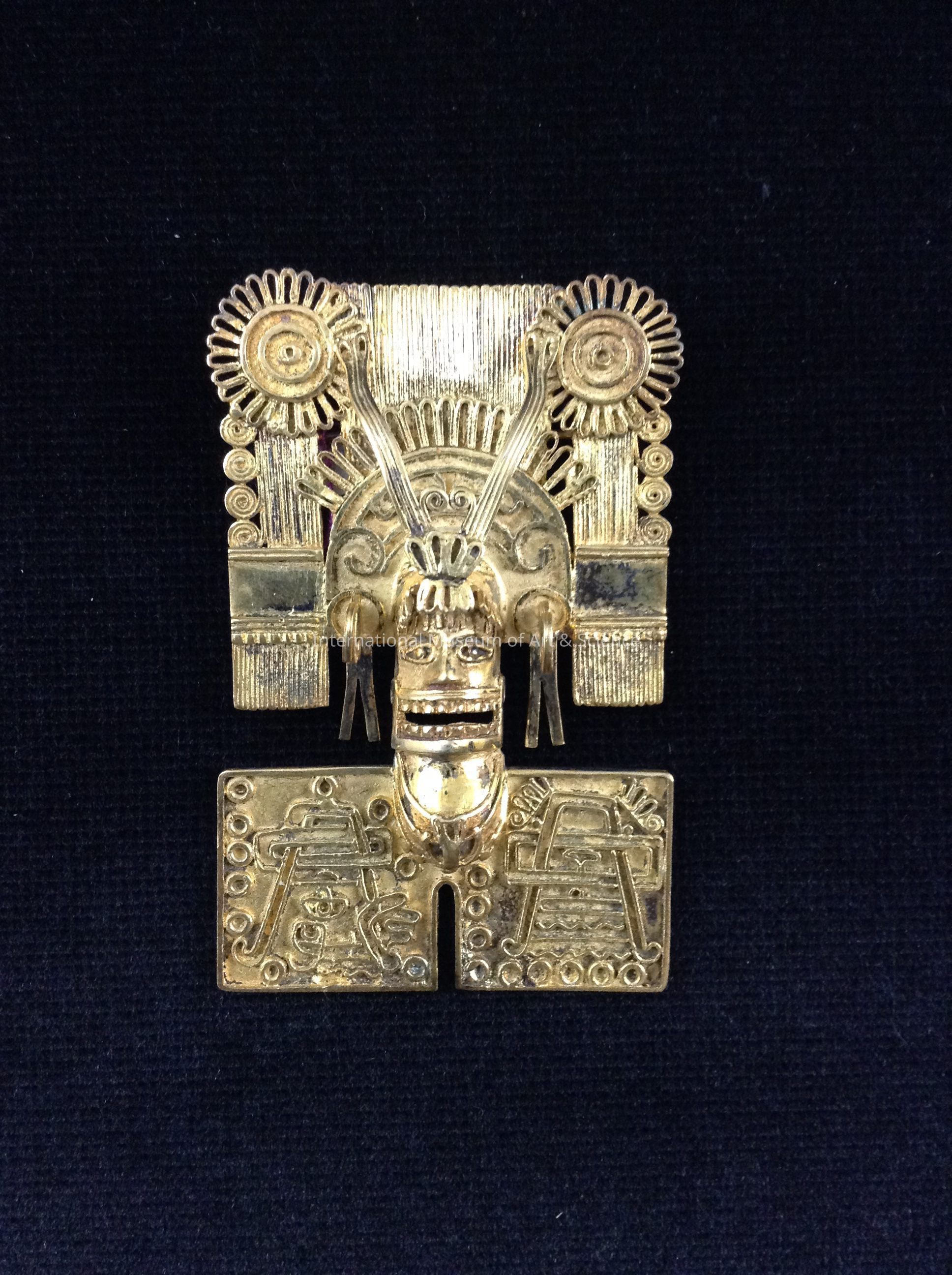 A gold-plate silver brooch. It can be used as a brooch or necklace. It depicts the God of Death, "Mictlantecutli". There is a square headdress on God of Death with floral, scalloped and linear carvings. The two square shoulders have pyramid and geometric designs. There are projected earrings and rays in relief. A fine idol mask depicted. It is flat on the reverse with rings in relief and brooch-pin.Made/Created