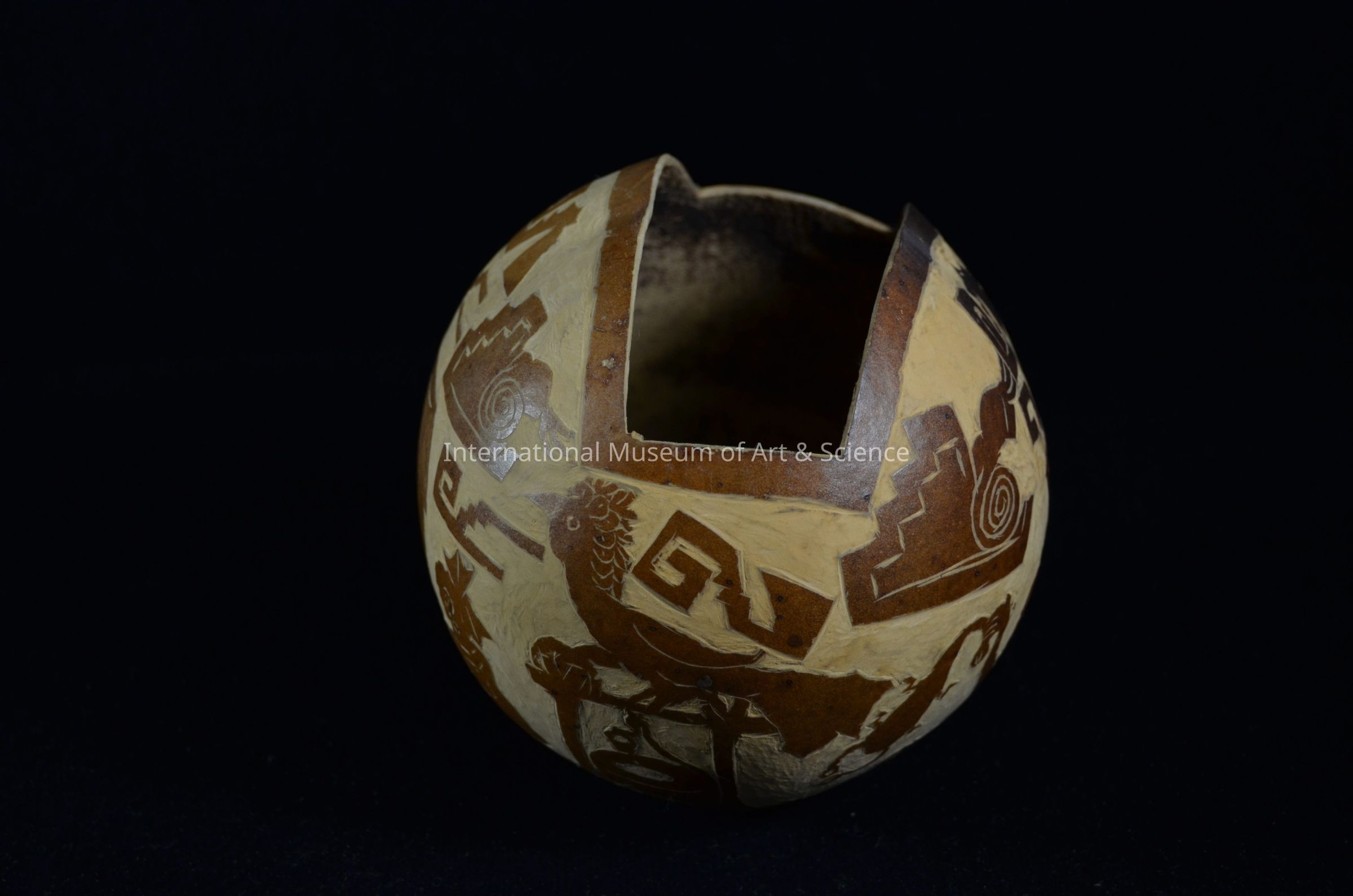 Gourd Container. Merida, Yucatan, Mexico. Andres Lizama. Gourd. 1987. Gourd container; spherical with Maya-inspired carvings; natural light brown and dark brown, incised; figures depict horse with carriage, Mayan god figured, a hut, man calling deer, rooster or bird figure setting on a well with drawn bucket of water; man holding an animal by the neck; also other abstract figures.