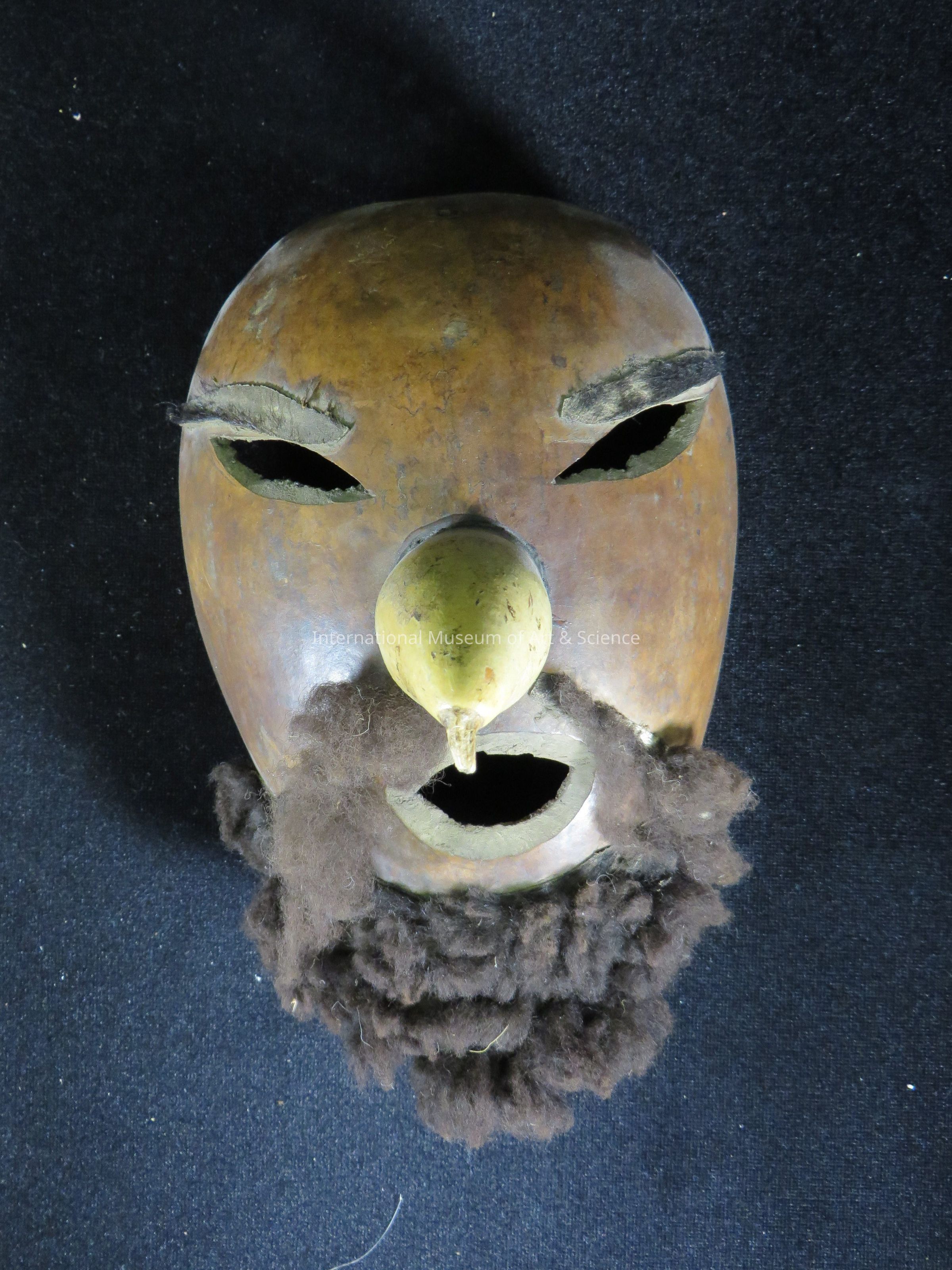 Gourd mask. Smaller gourd inserted as nose; fiber moustache and beard. Small rounded gourd mask, bulbous nose, opened carvings for oval eyes and downward crescent mouth, dark brown wool for eyebrows, moustache, and beard.; gourd nose color is natural yellowish-cream; gourd face of natural orange-brown color.Dimensions