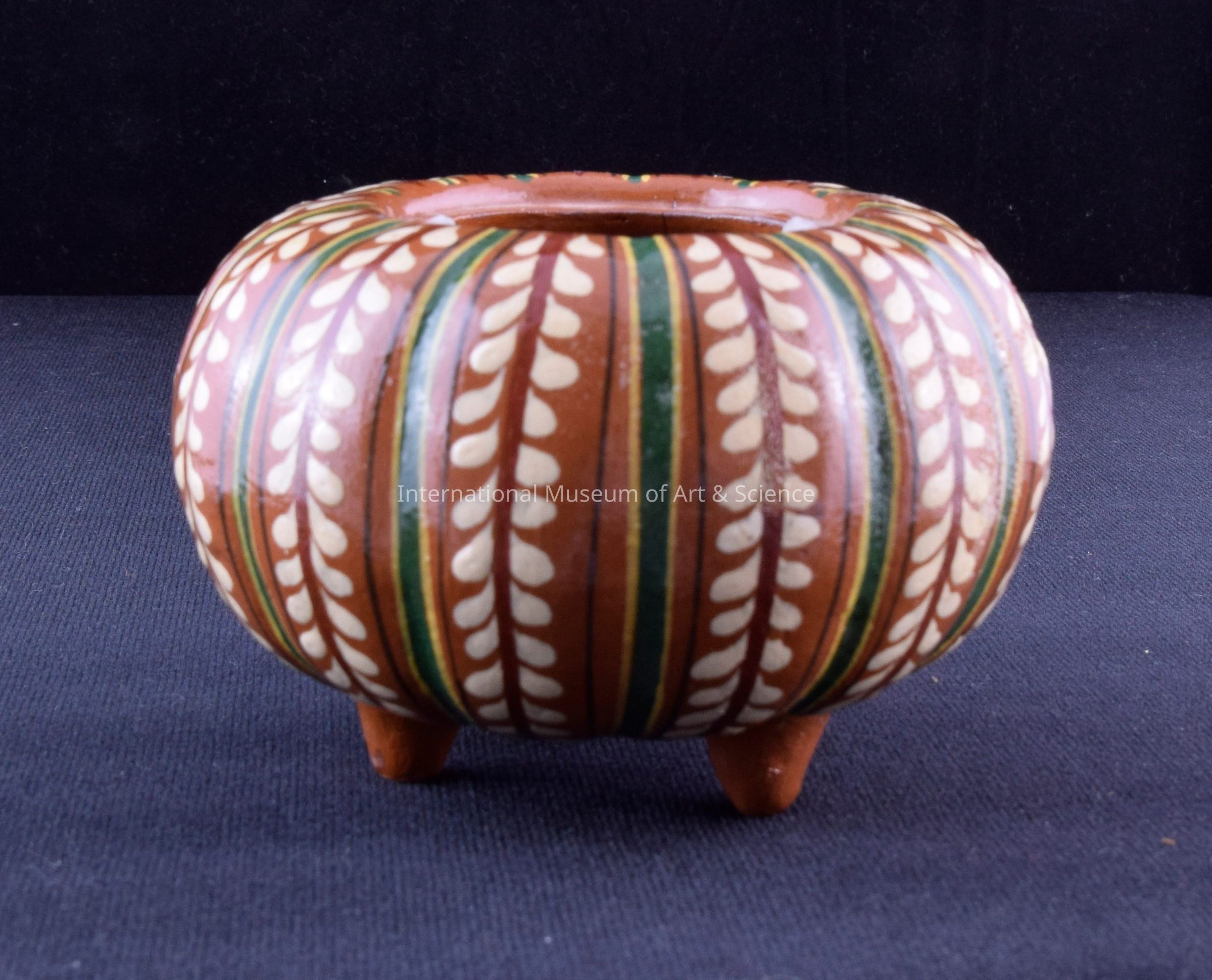 a) Gourd painted with rust brown background, vertical stripes of green, yellow, black, and cream leaf motifs consecutively; three small feet under base; 3 1/2" x 2 1/8" diam. top (8.9cm x 5.4cm)