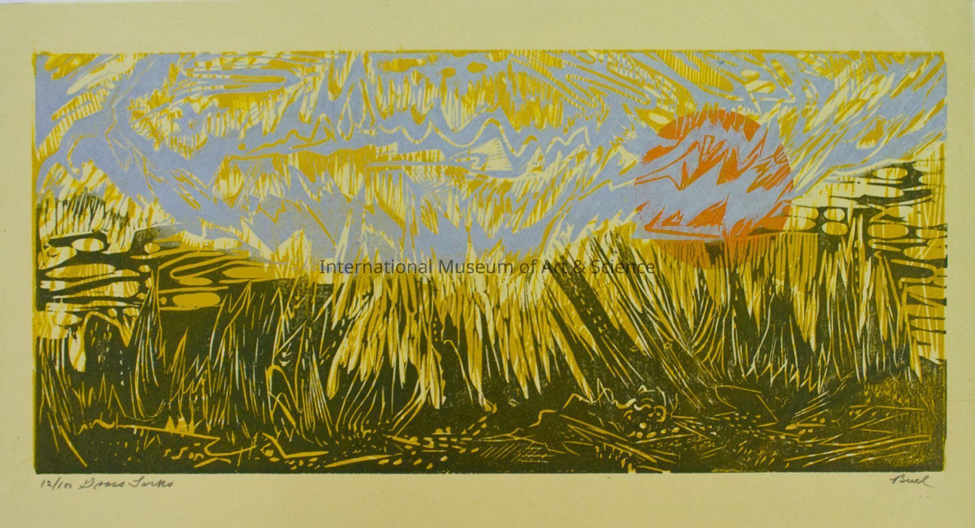 "Grass Larks." Nellie Buel, American. Abstract art piece on rectangular shape rice paper; cream color mat board; shades of cream, yellow greenish black, orange filled circle of sun visible; silver sky grass-like patterns; 12/100.Artwork Details