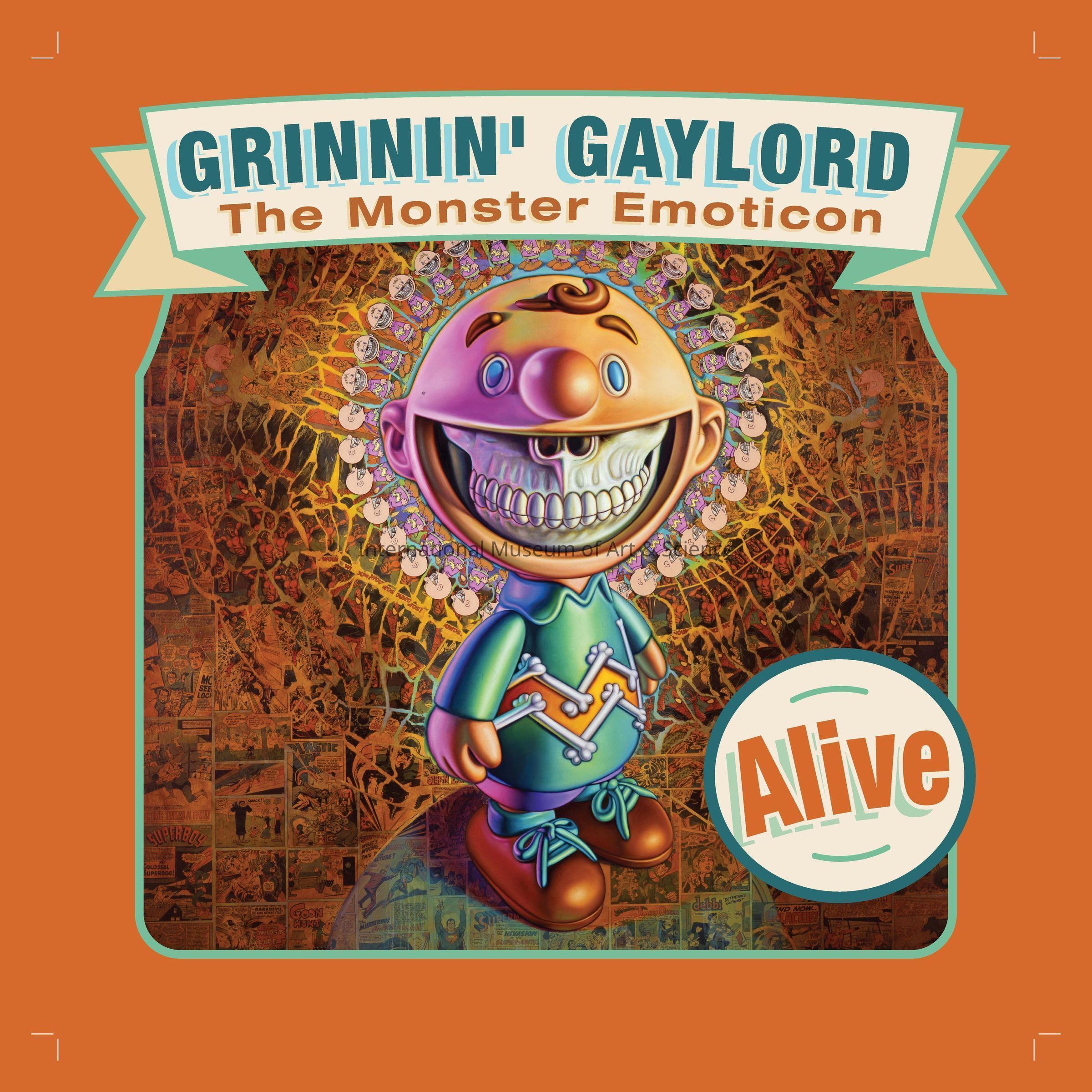 "Grinnin' Gaylord, The Monster Emoticon." Ron English, American. Digital Print, 2011. Side Show format, orange border with a kid that you can see his skull through his grinning mouth as the central figure. Wording around the central figure: "Grinnin' Gaylord, The Monster Emoticon" and "Alive."