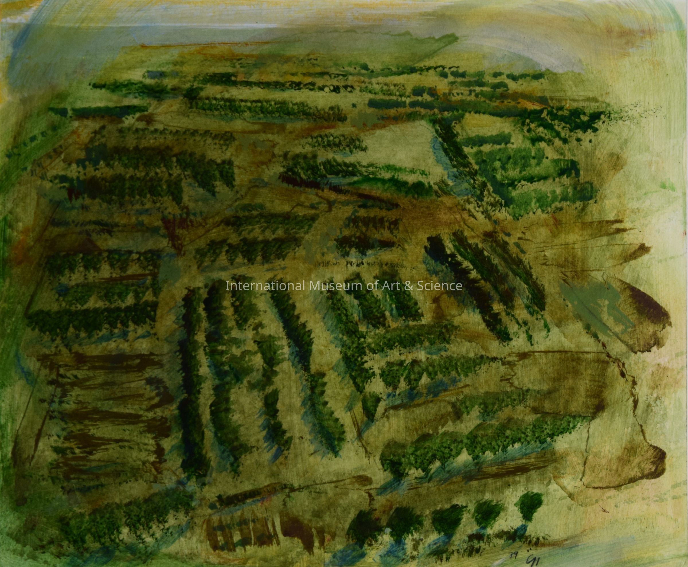 "Grovescape with Triangular Lake" E. E. Nichols, American. Acrylic on Paper, 1979. The viewer is shown the Rio Grande Valley citrus groves through the eyes of a bird. The work depicts a yellow-green and burnt sienna aerial view of groves in vertical and horizontal facets. The blue-green triangular lake can be found at the top right sector of the piece and the artist signature "eN" can be found at the bottom right.Artwork Details
