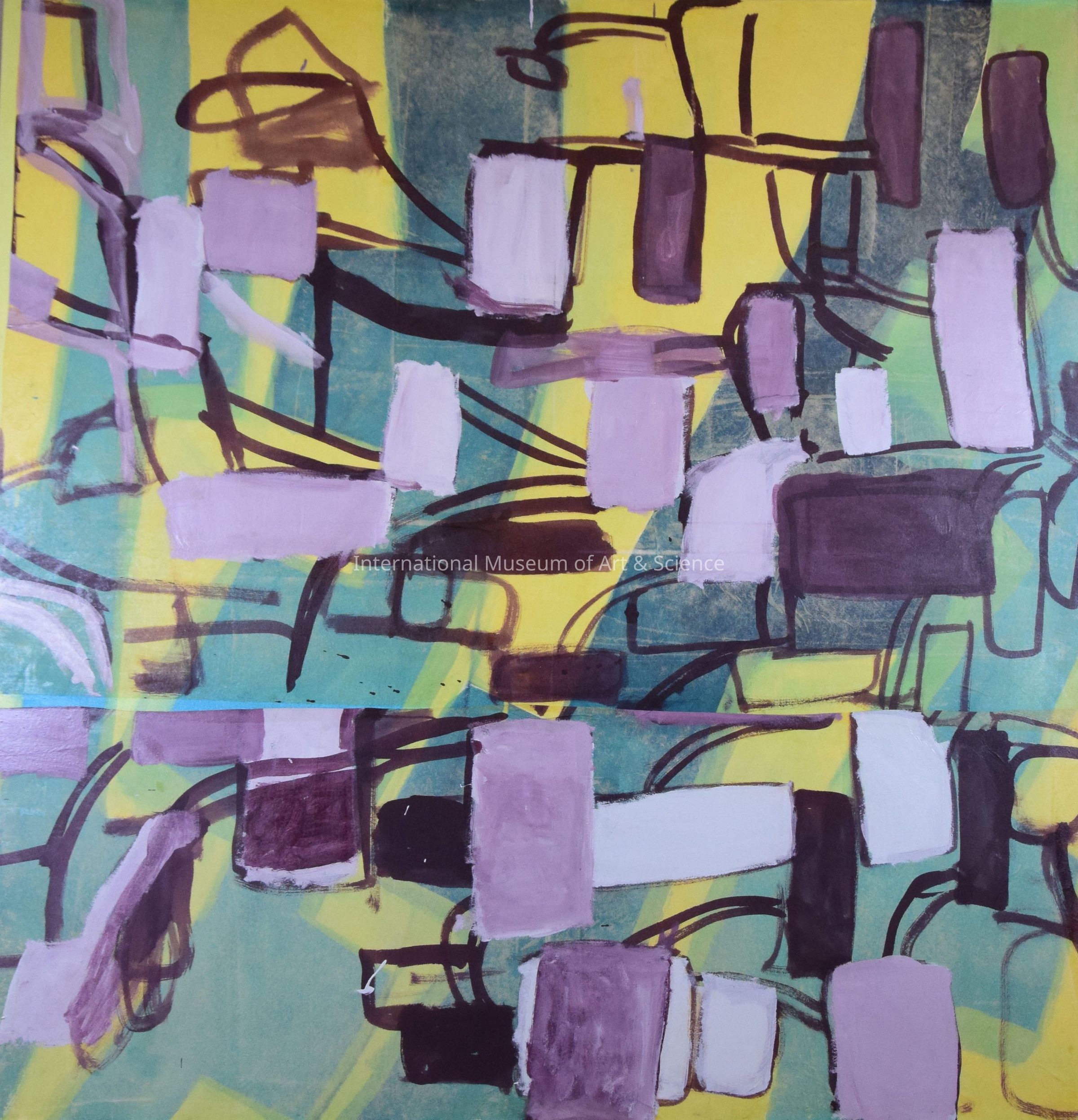 A large abstract painting. The painting consists of rectangle shapes of colors and lines. The predominate colors are green, yellow, and purple.Artwork Details