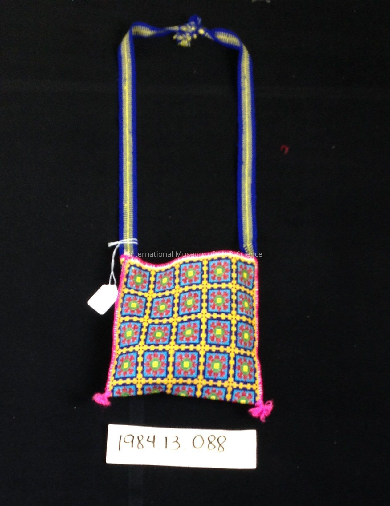 Bag. Pink tassels hang on corners; strap of dark blue with yellow horizontal stripes; body fully embroidered floral designs.Artwork Details