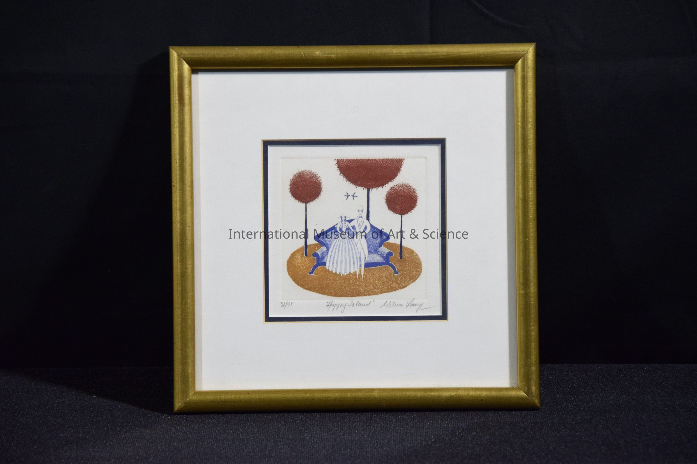 "Happy Island", Wilma Langhamer. Couple sitting on chaise on brown island with three trees.