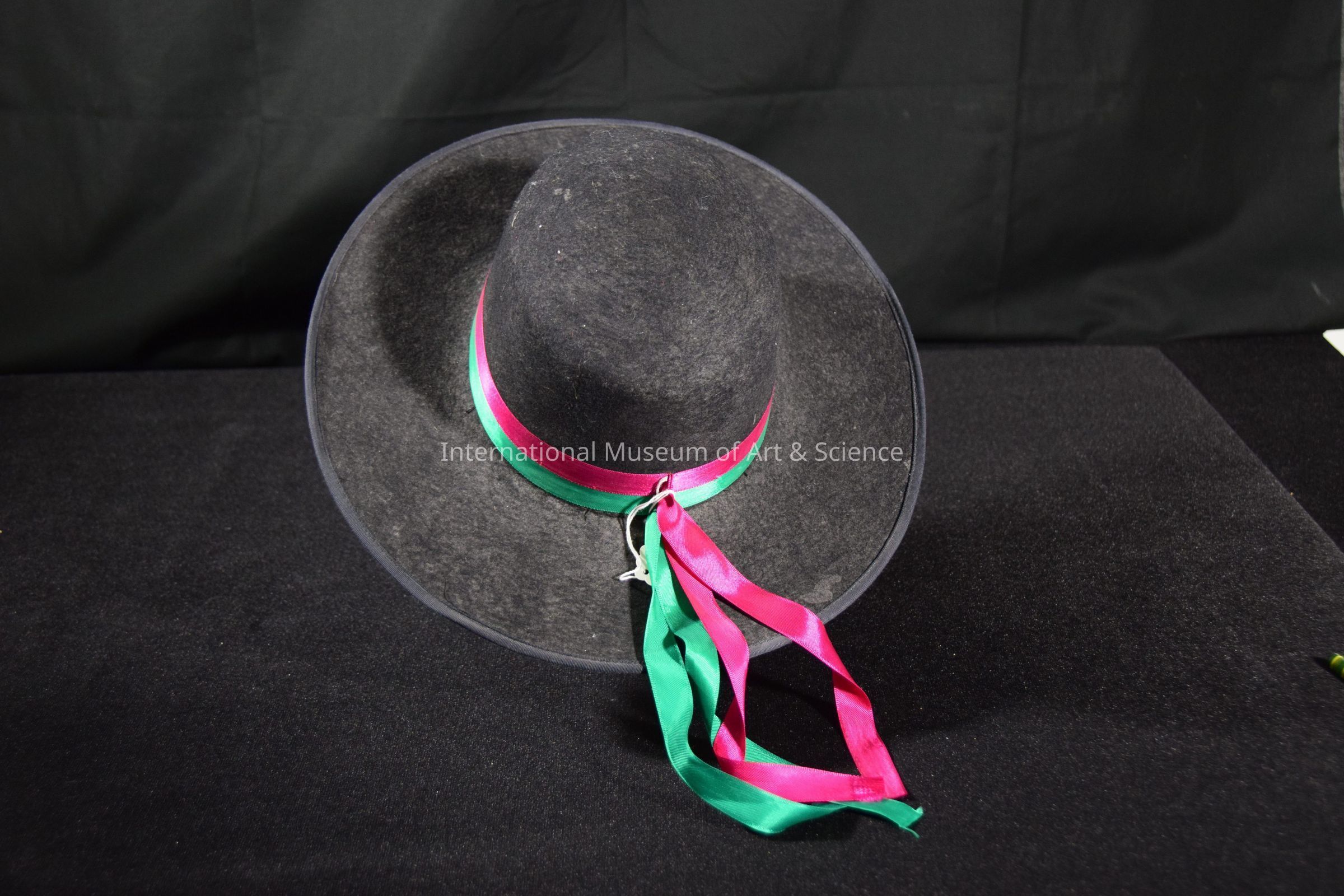 Sombrero de Farises (Hat of the Pharisees). Wide black, flat brim, flat round head area tied at bottom w/ 2 ribbons. Ribbons are green & fushia. Inside is lined and has manufacturer info.Dimensions