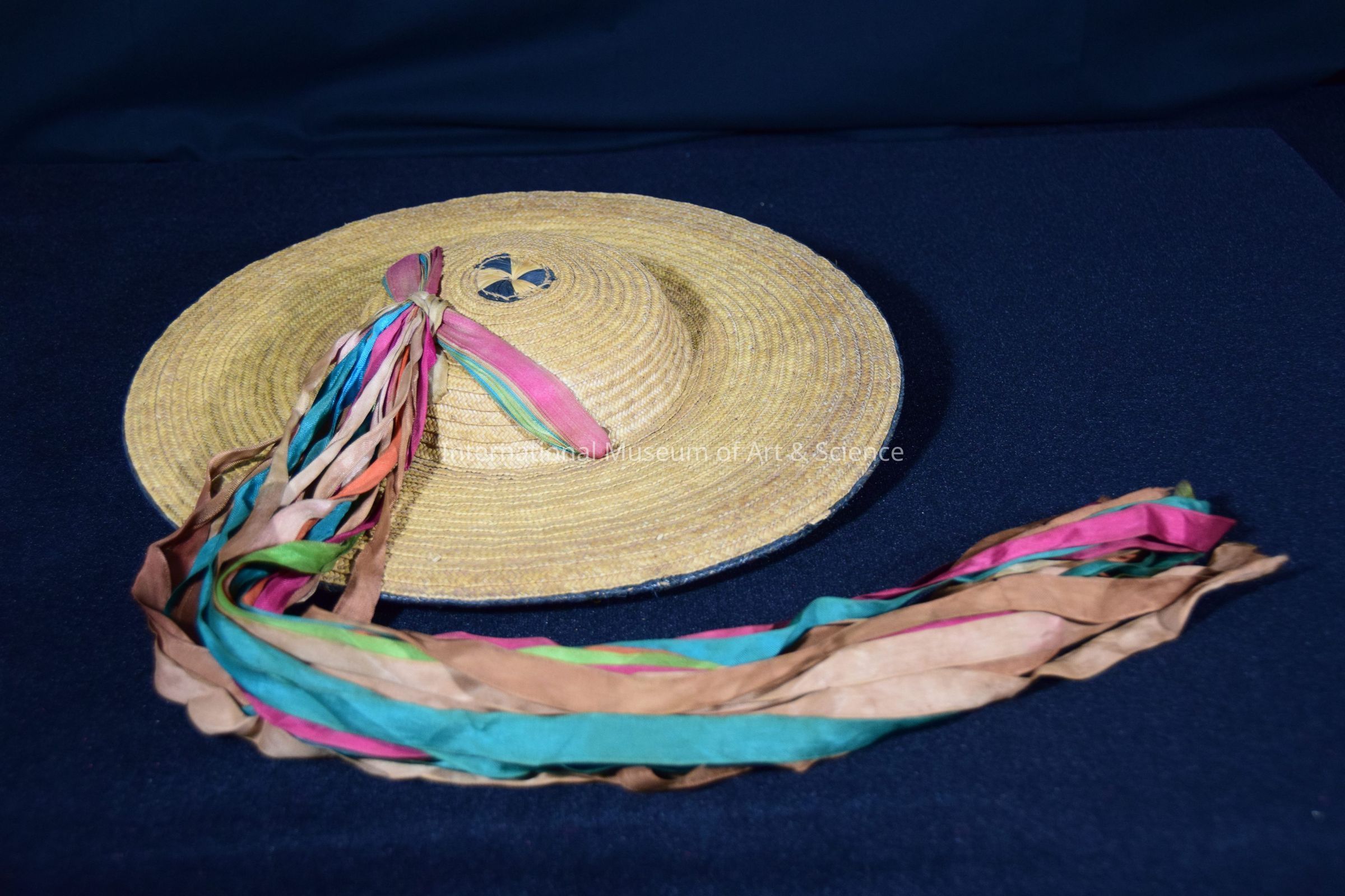 Hat. Shallow dome shaped crown with black and natural palm leaves at center; attached to crown long multicolored bands of rayon ribbons; large round brim of natural woven palm leaves and border of brim of black woven palm leaves; tow long strips of leather attached under hat with a strip of green rayon ribbon.Artwork Details