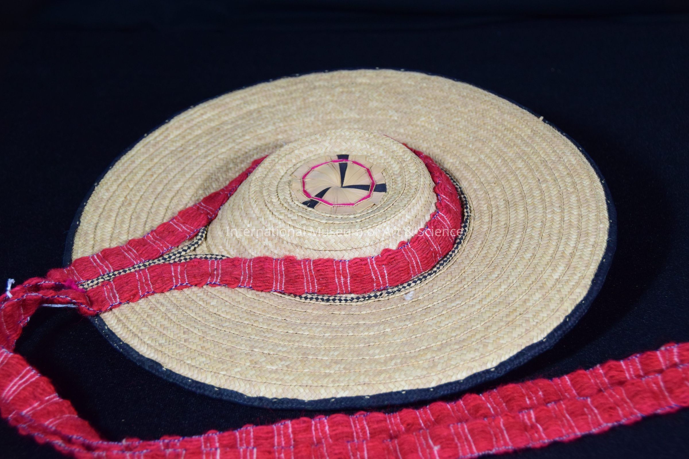Hat. Shallow dome-shaped crown with black and natrual palm leaves decorated at center with pink acrylic yarn; edge of crown outlined with black and natural palm leaves braided; large round braid.Artwork Details