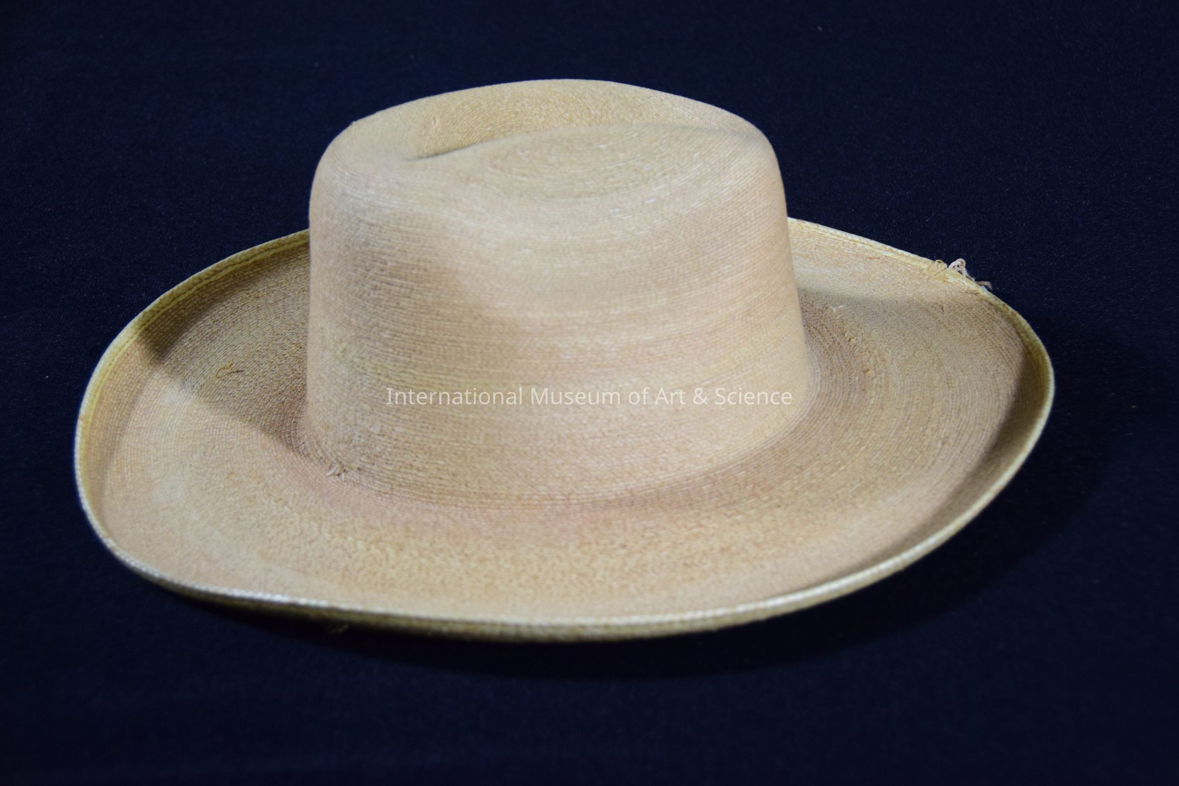 Hat. Hat woven of natural beige palm leaves; wide round rim and high crown; hat form and strips sewn by special machines.Made/Created