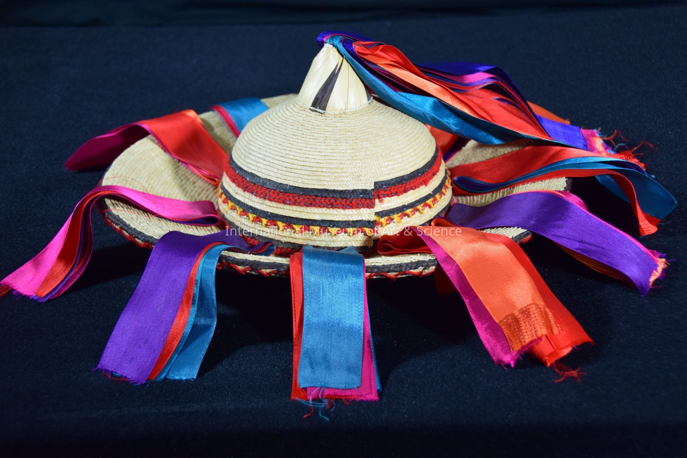Sombrero (hat). Round, flat brim, many ribbons attached at top & sides of round part of hat; red & black around hat & brim.