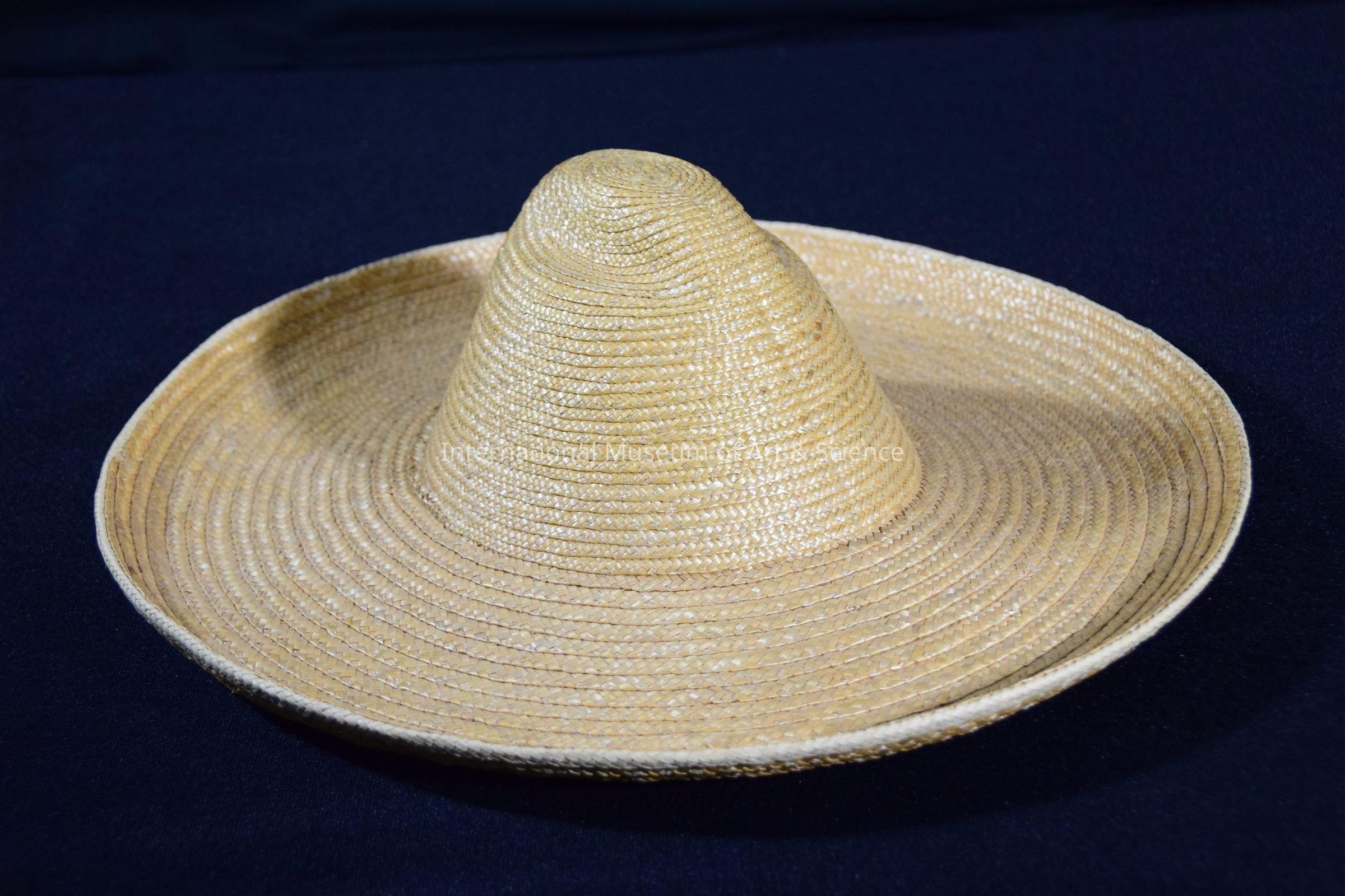Hat. Double-play of palm; pointed top; white cotton string bow on the rim; overall layers of woven palm form large round hat with pointed top; natural color.