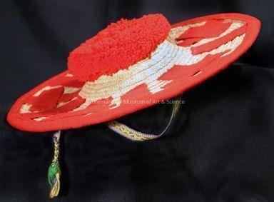 Round woven straw, red felt border, 5 single red felt rectangles, 5 crosses made of red rectangular felt, red yarn on center top of hat, chin strap made of yellow & blue yarn with yellow, blue & green tassles on end